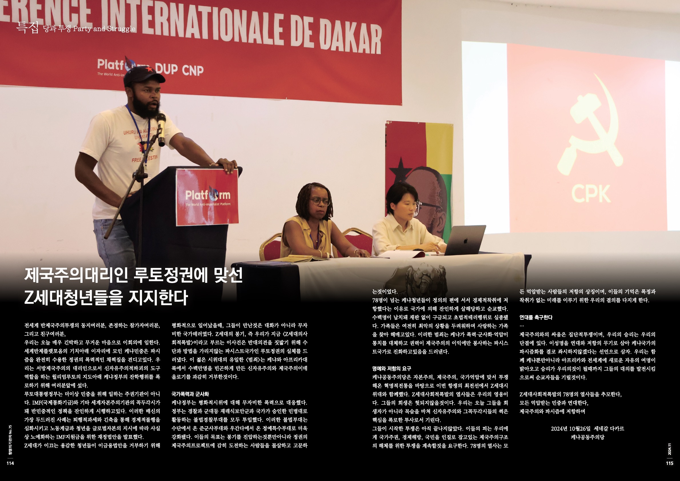 우리는 오늘 매우 긴박하고 무거운 마음으로 이회의에 임한다. 세계반제플랫포옴의 기치아래 이자리에 모인 케냐민중은 파시즘을 완전히 수용한 정권의 폭력적인 채찍질을 견디고있다. 우리는 서방제국주의의 대리인으로서 신자유주의적파괴의 도구역할을 하는 윌리엄루토의 지도아래 케냐정부의 잔학행위를 폭로하기 위해 여러분앞에 섰다.