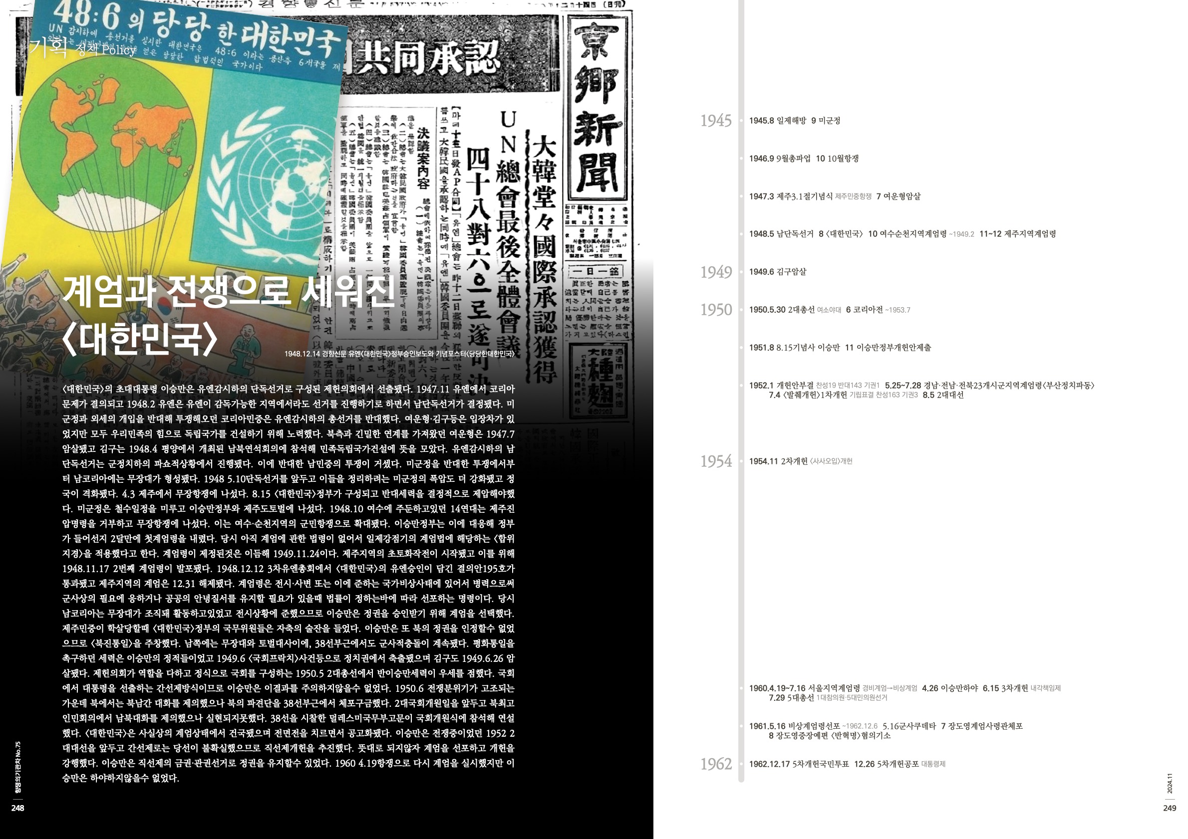 <대한민국>의 초대대통령 이승만은 유엔감시하의 단독선거로 구성된 제헌의회에서 선출됐다. 1947.11 유엔에서 코리아문제가 결의되고 1948.2 유엔은 유엔이 감독가능한 지역에서라도 선거를 진행하기로 하면서 남단독선거가 결정됐다. 미군정과 외세의 개입을 반대해 투쟁해오던 코리아민중은 유엔감시하의 총선거를 반대했다. 여운형·김구등은 입장차가 있었지만 모두 우리민족의 힘으로 독립국가를 건설하기 위해 노력했다. 북측과 긴밀한 연계를 가져왔던 여운형은 1947.7 암살됐고 김구는 1948.4 평양에서 개최된 남북연석회의에 참석해 민족독립국가건설에 뜻을 모았다. 유엔감시하의 남단독선거는 군정치하의 파쇼적상황에서 진행됐다. 이에 반대한 남민중의 투쟁이 거셌다. 미군정을 반대한 투쟁에서부터 남코리아에는 무장대가 형성됐다. 1948 5.10단독선거를 앞두고 이들을 정리하려는 미군정의 폭압도 더 강화됐고 정국이 격화됐다. 4.3 제주에서 무장항쟁에 나섰다. 8.15 <대한민국>정부가 구성되고 반대세력을 결정적으로 제압해야했다. 미군정은 철수일정을 미루고 이승만정부와 제주도토벌에 나섰다. 1948.10 여수에 주둔하고있던 14연대는 제주진압명령을 거부하고 무장항쟁에 나섰다. 이는 여수·순천지역의 군민항쟁으로 확대됐다. 이승만정부는 이에 대응해 정부가 들어선지 2달만에 첫계엄령을 내렸다. 당시 아직 계엄에 관한 법령이 없어서 일제강점기의 계엄법에 해당하는 <합위지경>을 적용했다고 한다. 계엄령이 제정된것은 이듬해 1949.11.24이다. 제주지역의 초토화작전이 시작됐고 이를 위해 1948.11.17 2번째 계엄령이 발포됐다. 1948.12.12 3차유엔총회에서 <대한민국>의 유엔승인이 담긴 결의안195호가 통과됐고 제주지역의 계엄은 12.31 해제됐다. 계엄령은 전시·사변 또는 이에 준하는 국가비상사태에 있어서 병력으로써 군사상의 필요에 응하거나 공공의 안녕질서를 유지할 필요가 있을때 법률이 정하는바에 따라 선포하는 명령이다. 당시 남코리아는 무장대가 조직돼 활동하고있었고 전시상황에 준했으므로 이승만은 정권을 승인받기 위해 계엄을 선택했다. 제주민중이 학살당할때 <대한민국>정부의 국무위원들은 자축의 술잔을 들었다. 이승만은 또 북의 정권을 인정할수 없었으므로 <북진통일>을 주창했다. 남쪽에는 무장대와 토벌대사이에, 38선부근에서도 군사적충돌이 계속됐다. 평화통일을 촉구하던 세력은 이승만의 정적들이었고 1949.6 <국회프락치>사건등으로 정치권에서 축출됐으며 김구도 1949.6.26 암살됐다. 제헌의회가 역할을 다하고 정식으로 국회를 구성하는 1950.5 2대총선에서 반이승만세력이 우세를 점했다. 국회에서 대통령을 선출하는 간선제방식이므로 이승만은 이결과를 주의하지않을수 없었다. 1950.6 전쟁분위기가 고조되는 가운데 북에서는 북남간 대화를 제의했으나 북의 파견단을 38선부근에서 체포구금했다. 2대국회개원일을 앞두고 북최고인민회의에서 남북대화를 제의했으나 실현되지못했다. 38선을 시찰한 덜레스미국무부고문이 국회개원식에 참석해 연설했다. <대한민국>은 사실상의 계엄상태에서 건국됐으며 전면전을 치르면서 공고화됐다. 이승만은 전쟁중이었던 1952 2대대선을 앞두고 간선제로는 당선이 불확실했으므로 직선제개헌을 추진했다. 뜻대로 되지않자 계엄을 선포하고 개헌을 강행했다. 이승만은 직선제의 금권·관권선거로 정권을 유지할수 있었다. 1960 4.19항쟁으로 다시 계엄을 실시했지만 이승만은 하야하지않을수 없었다.