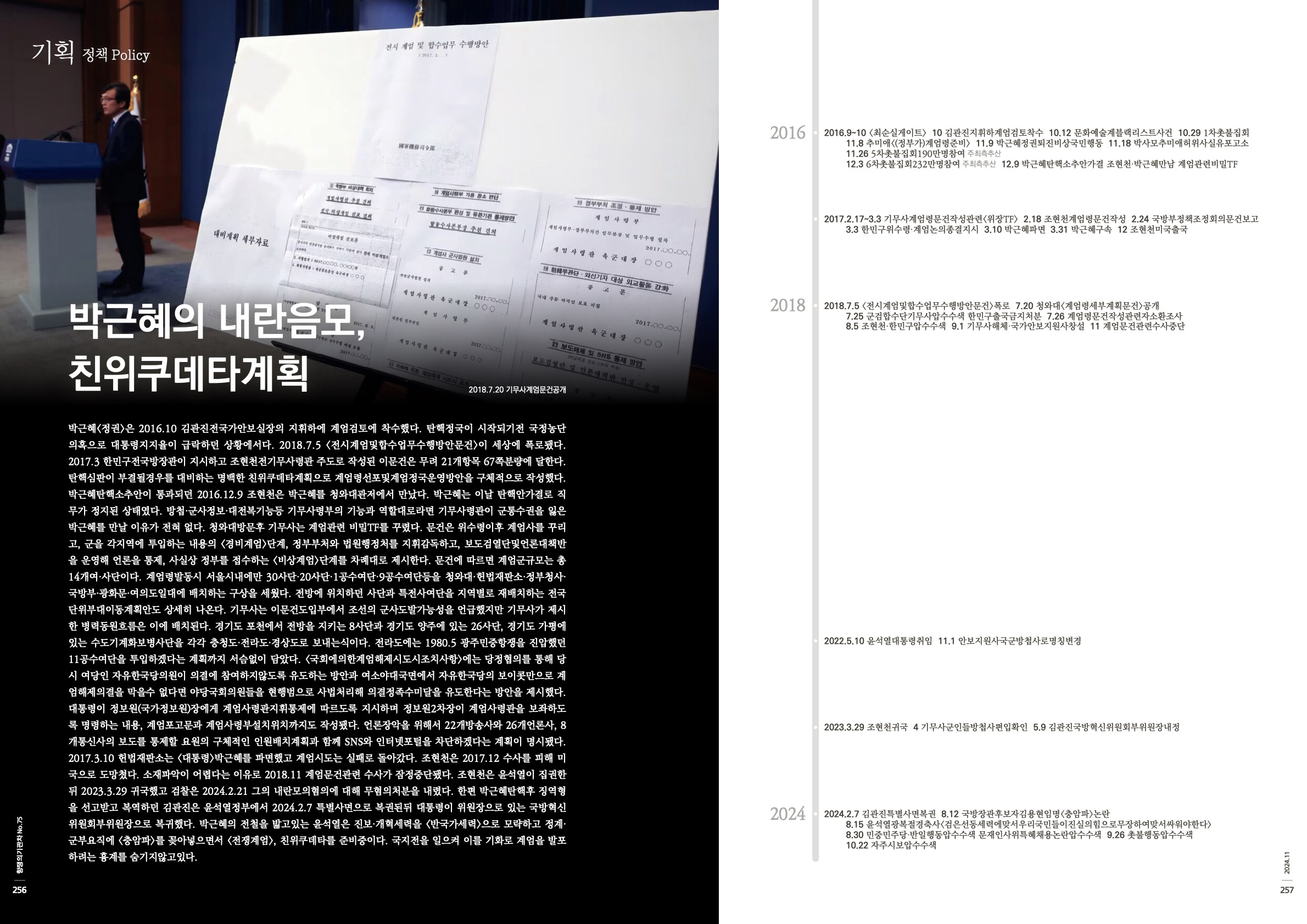 박근혜<정권>은 2016.10 김관진전국가안보실장의 지휘하에 계엄검토에 착수했다. 탄핵정국이 시작되기전 국정농단의혹으로 대통령지지율이 급락하던 상황에서다. 2018.7.5 <전시계엄및합수업무수행방안문건>이 세상에 폭로됐다. 2017.3 한민구전국방장관이 지시하고 조현천전기무사령관 주도로 작성된 이문건은 무려 21개항목 67쪽분량에 달한다. 탄핵심판이 부결될경우를 대비하는 명백한 친위쿠데타계획으로 계엄령선포및계엄정국운영방안을 구체적으로 작성했다. 박근혜탄핵소추안이 통과되던 2016.12.9 조현천은 박근혜를 청와대관저에서 만났다. 박근혜는 이날 탄핵안가결로 직무가 정지된 상태였다. 방첩·군사정보·대전복기능등 기무사령부의 기능과 역할대로라면 기무사령관이 군통수권을 잃은 박근혜를 만날 이유가 전혀 없다. 청와대방문후 기무사는 계엄관련 비밀TF를 꾸렸다. 문건은 위수령이후 계엄사를 꾸리고, 군을 각지역에 투입하는 내용의 <경비계엄>단계, 정부부처와 법원행정처를 지휘감독하고, 보도검열단및언론대책반을 운영해 언론을 통제, 사실상 정부를 접수하는 <비상계엄>단계를 차례대로 제시한다. 문건에 따르면 계엄군규모는 총14개여·사단이다. 계엄령발동시 서울시내에만 30사단·20사단·1공수여단·9공수여단등을 청와대·헌법재판소·정부청사·국방부·광화문·여의도일대에 배치하는 구상을 세웠다. 전방에 위치하던 사단과 특전사여단을 지역별로 재배치하는 전국단위부대이동계획안도 상세히 나온다. 기무사는 이문건도입부에서 조선의 군사도발가능성을 언급했지만 기무사가 제시한 병력동원흐름은 이에 배치된다. 경기도 포천에서 전방을 지키는 8사단과 경기도 양주에 있는 26사단, 경기도 가평에 있는 수도기계화보병사단을 각각 충청도·전라도·경상도로 보내는식이다. 전라도에는 1980.5 광주민중항쟁을 진압했던 11공수여단을 투입하겠다는 계획까지 서슴없이 담았다. <국회에의한계엄해제시도시조치사항>에는 당정협의를 통해 당시 여당인 자유한국당의원이 의결에 참여하지않도록 유도하는 방안과 여소야대국면에서 자유한국당의 보이콧만으로 계엄해제의결을 막을수 없다면 야당국회의원들을 현행범으로 사법처리해 의결정족수미달을 유도한다는 방안을 제시했다. 대통령이 정보원(국가정보원)장에게 계엄사령관지휘통제에 따르도록 지시하며 정보원2차장이 계엄사령관을 보좌하도록 명령하는 내용, 계엄포고문과 계엄사령부설치위치까지도 작성됐다. 언론장악을 위해서 22개방송사와 26개언론사, 8개통신사의 보도를 통제할 요원의 구체적인 인원배치계획과 함께 SNS와 인터넷포털을 차단하겠다는 계획이 명시됐다. 2017.3.10 헌법재판소는 <대통령>박근혜를 파면했고 계엄시도는 실패로 돌아갔다. 조현천은 2017.12 수사를 피해 미국으로 도망쳤다. 소재파악이 어렵다는 이유로 2018.11 계엄문건관련 수사가 잠정중단됐다. 조현천은 윤석열이 집권한뒤 2023.3.29 귀국했고 검찰은 2024.2.21 그의 내란모의혐의에 대해 무혐의처분을 내렸다. 한편 박근혜탄핵후 징역형을 선고받고 복역하던 김관진은 윤석열정부에서 2024.2.7 특별사면으로 복권된뒤 대통령이 위원장으로 있는 국방혁신위원회부위원장으로 복귀했다. 박근혜의 전철을 밟고있는 윤석열은 진보·개혁세력을 <반국가세력>으로 모략하고 정계·군부요직에 <충암파>를 꽂아넣으면서 <전쟁계엄>, 친위쿠데타를 준비중이다. 국지전을 일으켜 이를 기화로 계엄을 발포하려는 흉계를 숨기지않고있다.