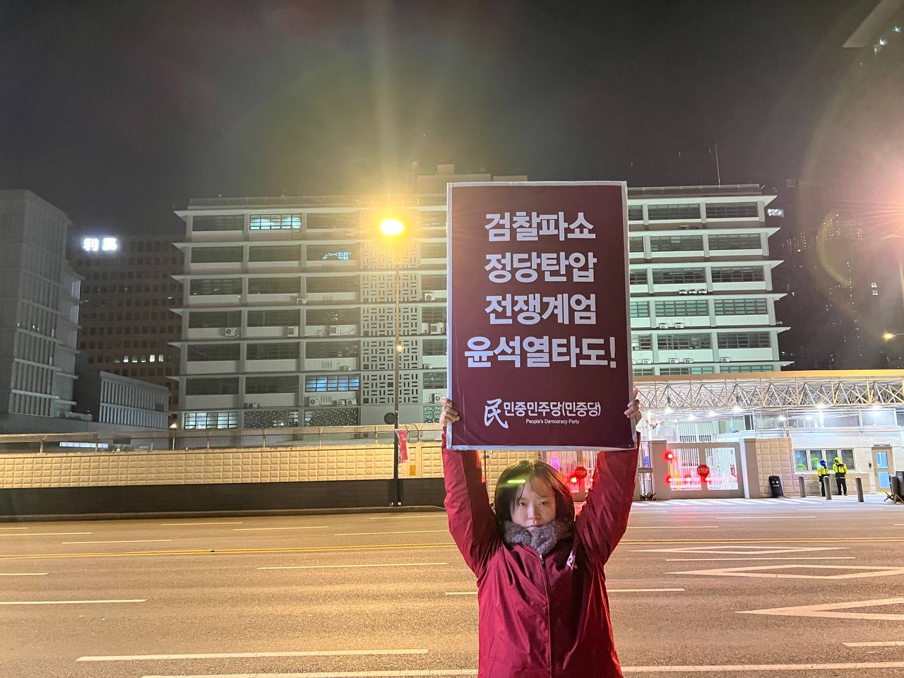 24일 민중민주당(민중당)은 미대사관앞에서 <친미호전윤석열타도! 북침핵전쟁책동중단! 핵전쟁화근 미군철거!> 구호를 들고 평화시위를 3049일째 전개했다.