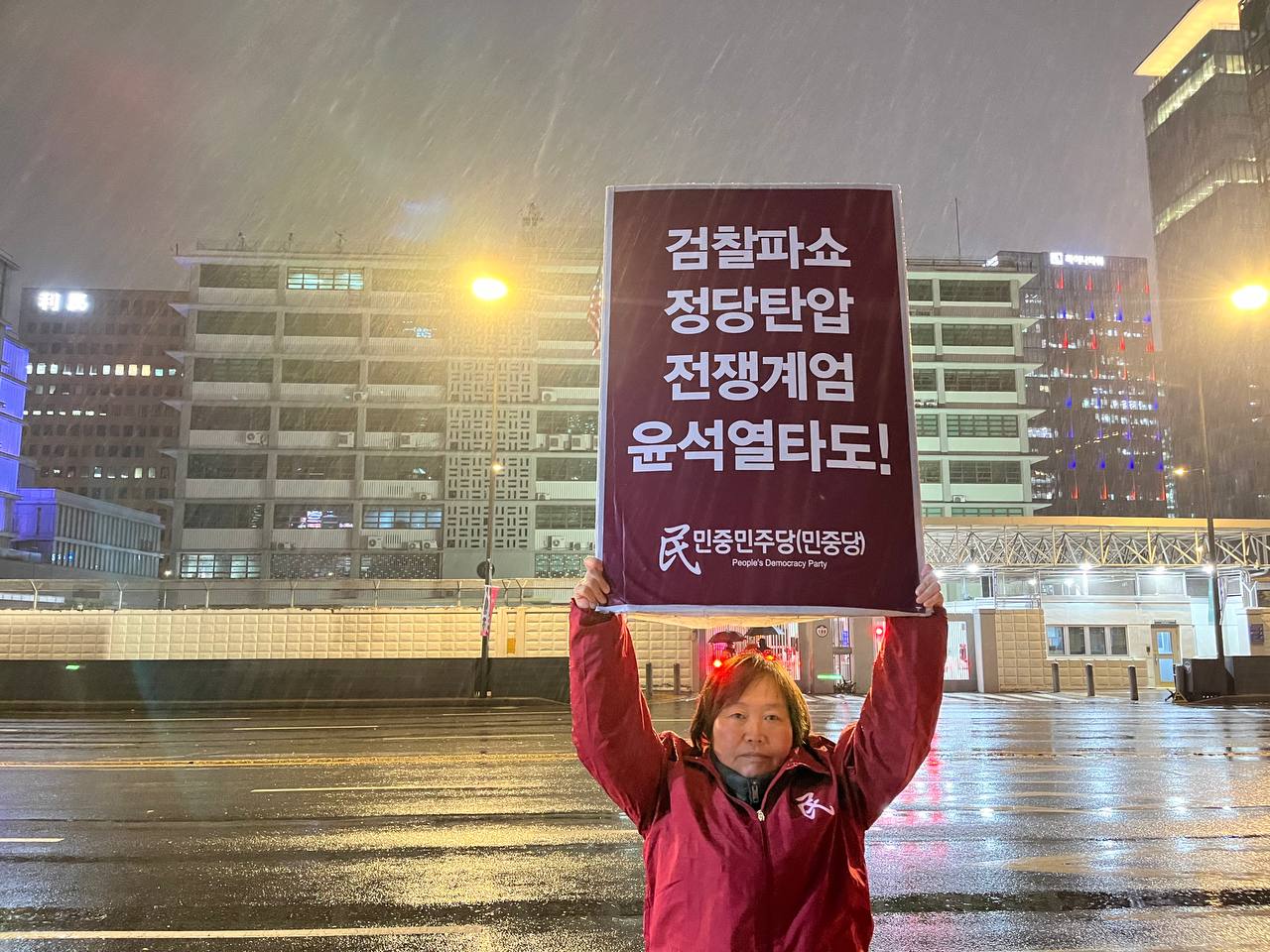 미대사관정문 맞은편에서는 우리말과 영어로 된 구호 <북침핵전쟁책동중단! 미군철거! 윤석열타도!>를 들고 <광화문미대사관앞철야시위>를 진행했다. <김병동석방! 윤석열타도!>, <검찰파쇼 정당탄압 전쟁계엄 윤석열타도!> 구호도 함께 들었다.