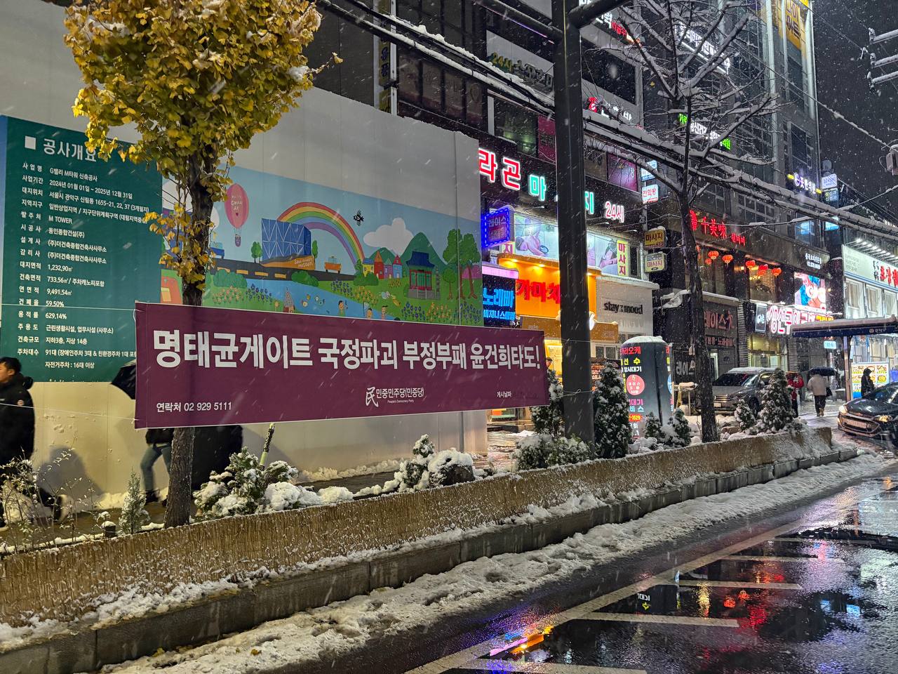 27일 민중민주당(민중당)서울시당은 구로디지털단지역앞과 사거리에 <명태균게이트 국정파괴 부정부패 윤건희타도!> 구호의 가로막을 게시했다.