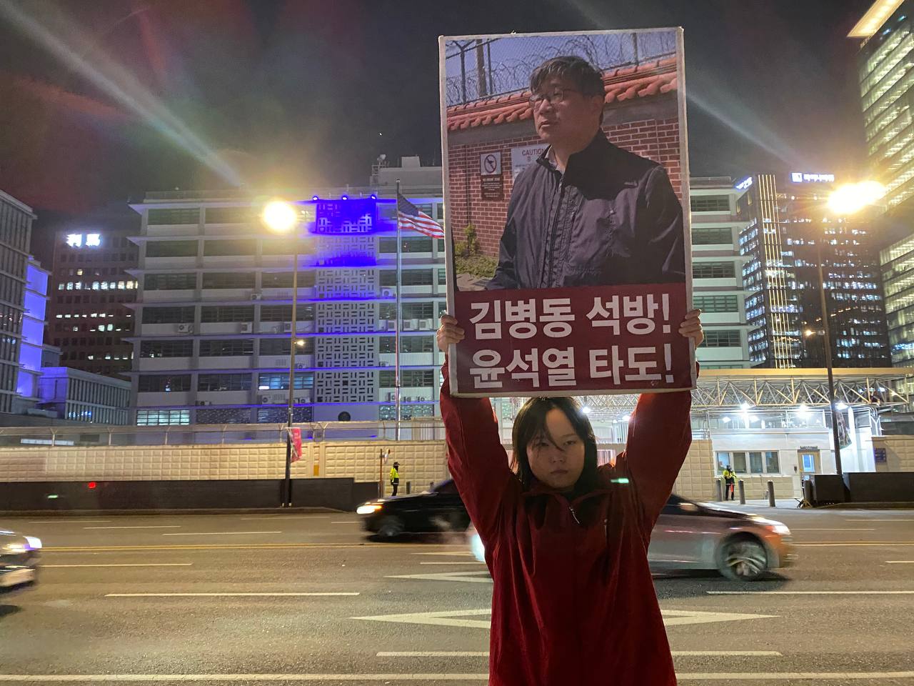 미대사관정문 맞은편에서는 우리말과 영어로 된 구호 <북침핵전쟁책동중단! 미군철거! 윤석열타도!>를 들고 <광화문미대사관앞철야시위>를 진행했다. <김병동석방! 윤석열타도!>, <검찰파쇼 정당탄압 전쟁계엄 윤석열타도!> 구호도 함께 들었다.