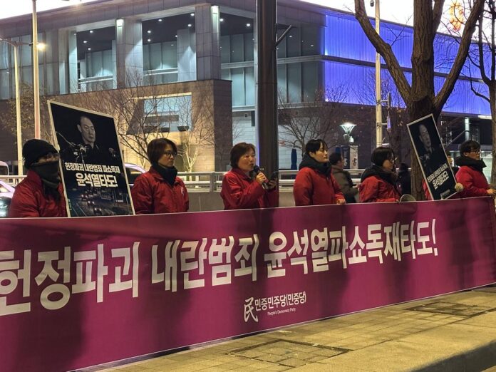 당원들은 <비상계엄 내란수괴 윤석열 체포하라!>, <헌정파괴 내란범죄 윤석열 체포하라!>, <국정파괴 부정부패 내란범죄 윤석열 타도하자!>, <파쇼광풍 전쟁폭풍 윤석열 타도하자!>, <계엄선포 민중탄압 윤석열 파쇼독재 타도하자!>, <윤석열 내란범을 즉각 체포하라!>, <반윤석열항쟁으로 윤석열 타도하자!> 구호를 외쳤다.