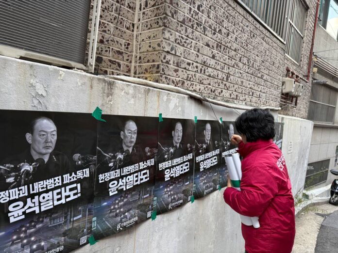 정당연설회 민중민주당, 서울3개구 당신문배포·포스터부착 … 〈반란수괴 윤석열 체포!〉 2024년 12월 6일 FacebookTwitter 5일 민중민주당(민중당)은 서울 중구 장충동, 서대문구, 은평구 일대 빌라, 아파트 등에 당신문 民127호 <헌정파괴 내란범죄 윤석열파쇼독재타도!>를 배포하고 거리에 <헌정파괴 내란범죄 파쇼독재 윤석열타도!> 구호의 포스터를 부착했다.