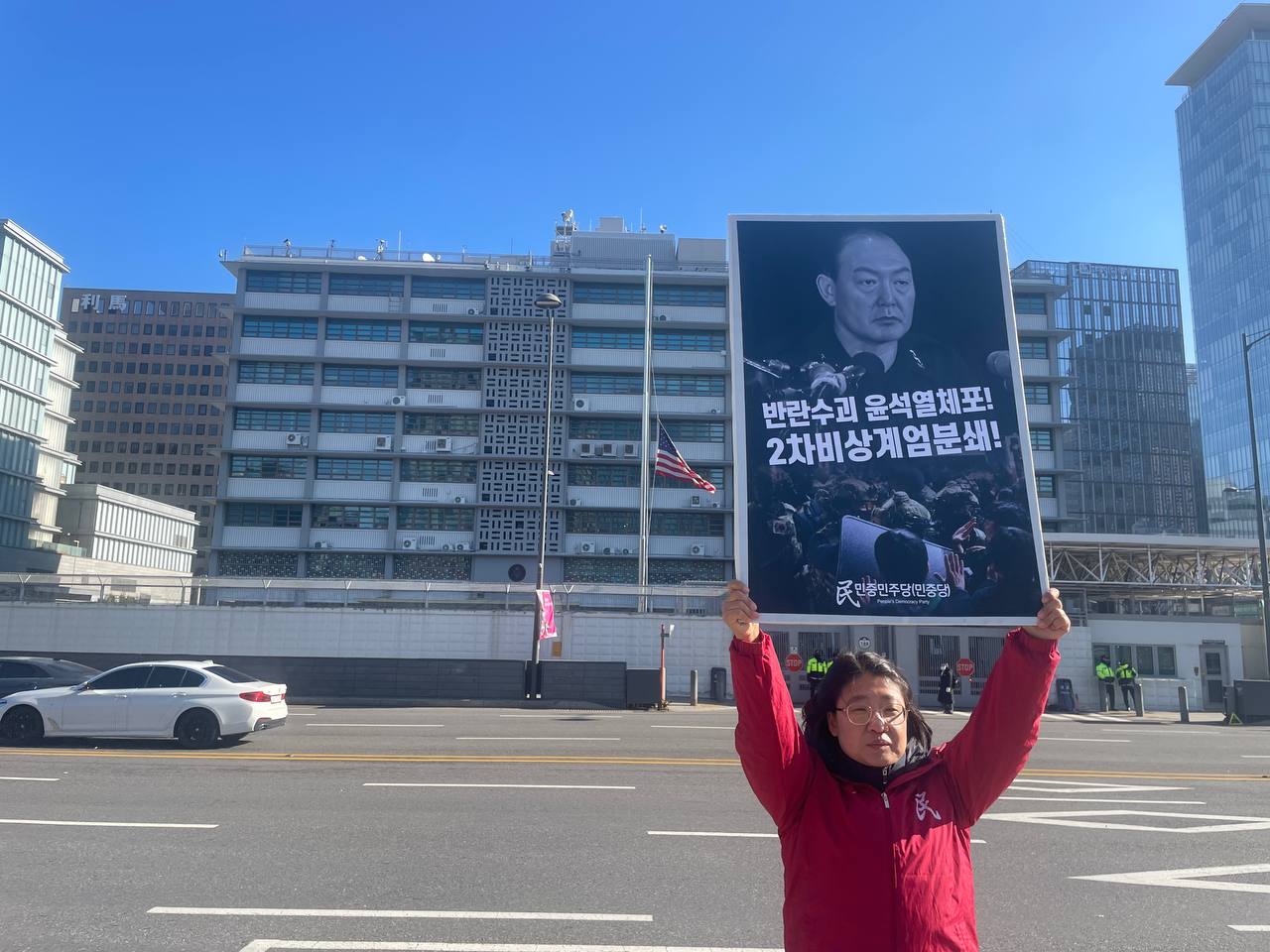 미대사관정문 맞은편에서는 우리말과 영어로 된 구호 <북침핵전쟁책동중단! 미군철거! 윤석열타도!>를 들고 <광화문미대사관앞철야시위>를 진행했다. <김병동석방! 윤석열타도!>, <친위쿠데타 반란수괴 윤석열체포!> 구호도 함께 들었다.