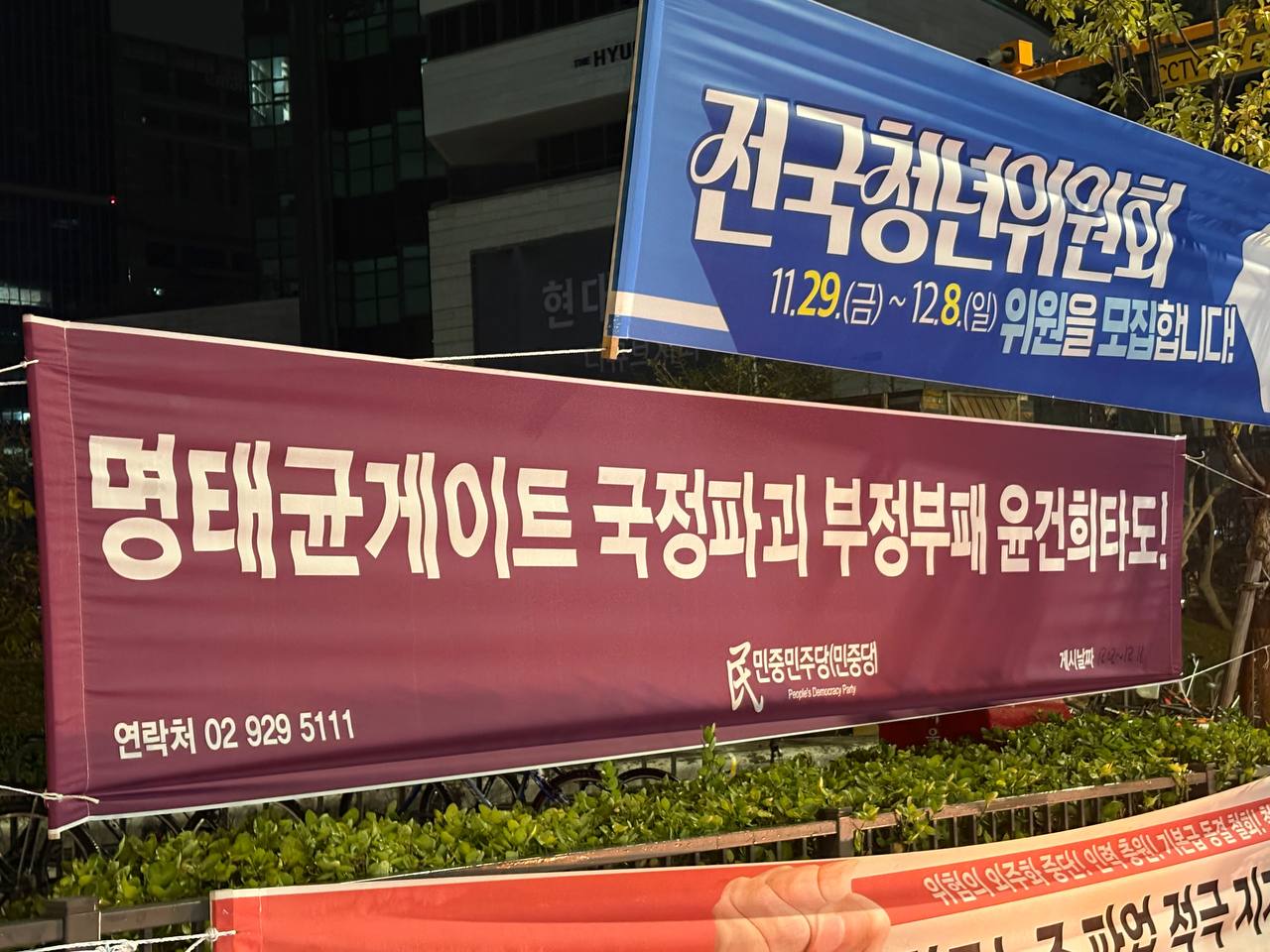 정당연설회 민중민주당, 2일 〈명태균게이트 국정파괴 부정부패 윤건희타도!〉가로막게시 2024년 12월 3일 FacebookTwitter 2일 민중민주당(민중당)은 경기 시흥 신천리, 서울 구로역앞, 신도림역앞, 영등포역앞, 인천 부평 캠프마켓구미군기지앞, 언서역앞에 <명태균게이트 국정파괴 부정부패 윤건희타도!> 가로막을 게시했다.
