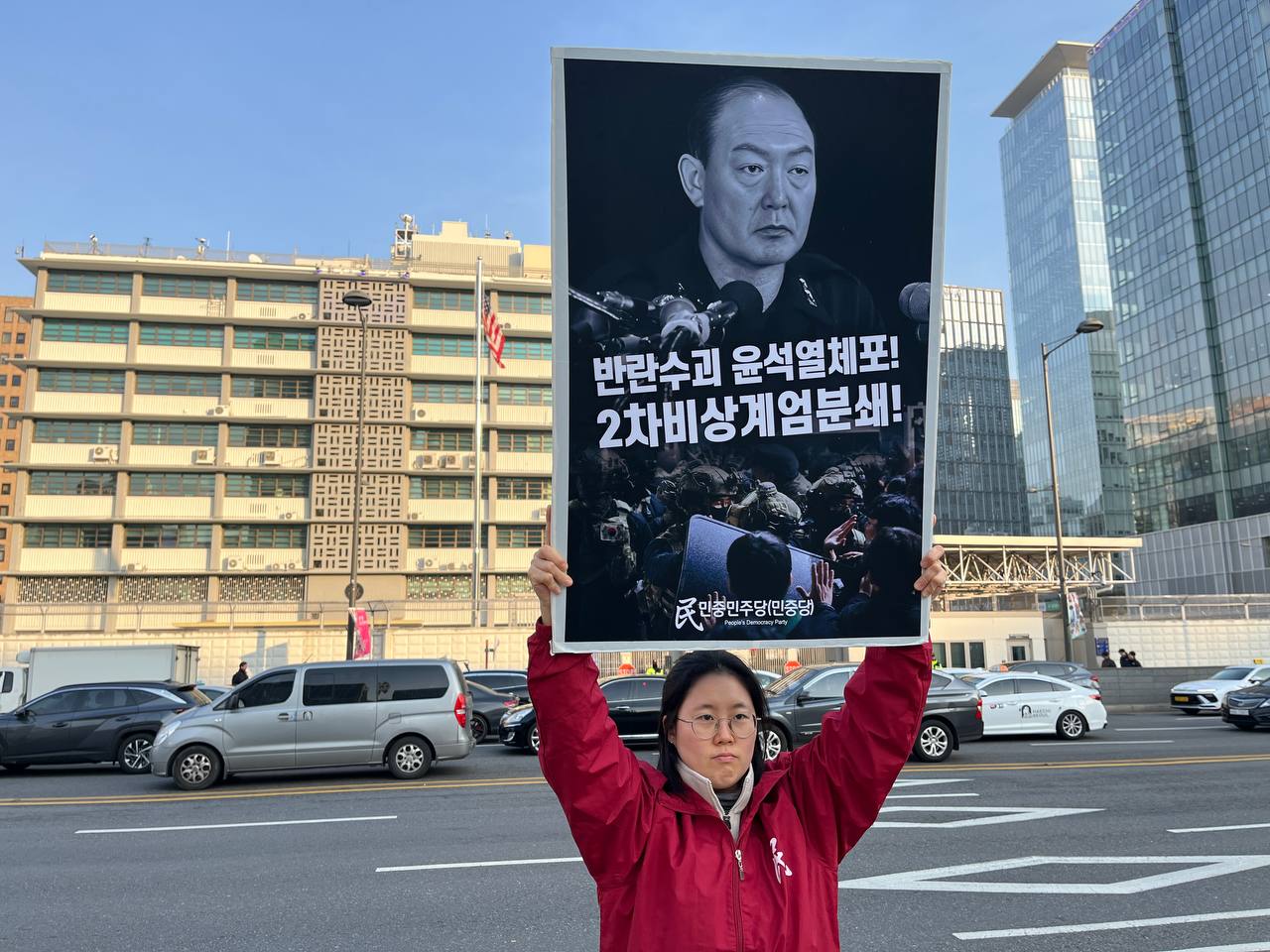 미대사관정문 맞은편에서는 우리말과 영어로 된 구호 <북침핵전쟁책동중단! 미군철거! 윤석열타도!>를 들고 <광화문미대사관앞철야시위>를 진행했다. <김병동석방! 윤석열타도!>, <친위쿠데타 반란수괴 윤석열체포!> 구호도 함께 들었다.