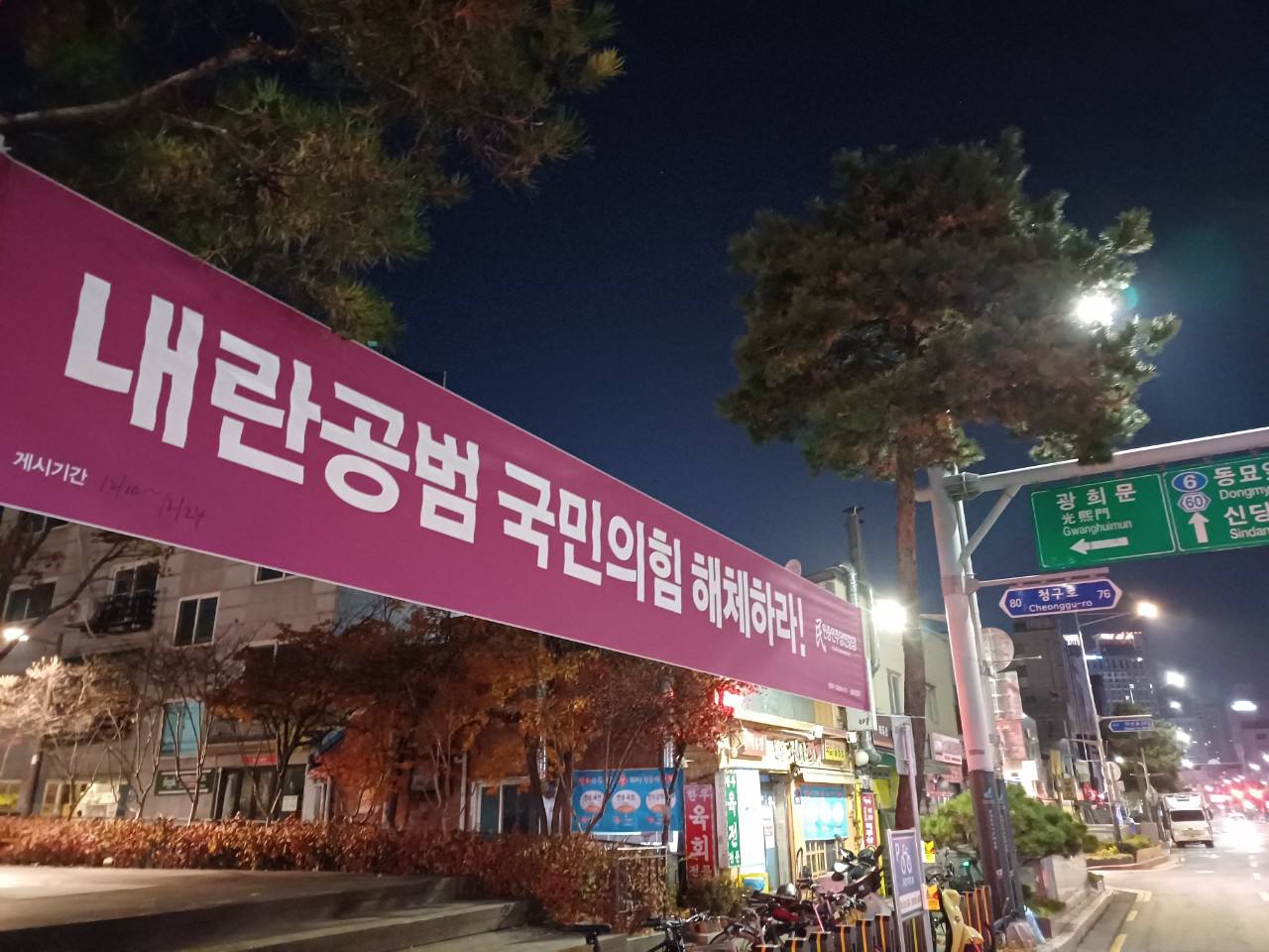 정당연설회 민중민주당, 서울 〈내란공범 국민의힘 해체하라!〉가로막게시 2024년 12월 11일 FacebookTwitter 10일 민중민주당(민중당)은 서울 중구 신당동·동화동·청구동·약수동·다산동·장충동·광희동, 종로구 숭인동·창신동·종로5~6가동 일대에 <내란공범 국민의힘 해체하라!> 구호의 가로막을 내걸었다.