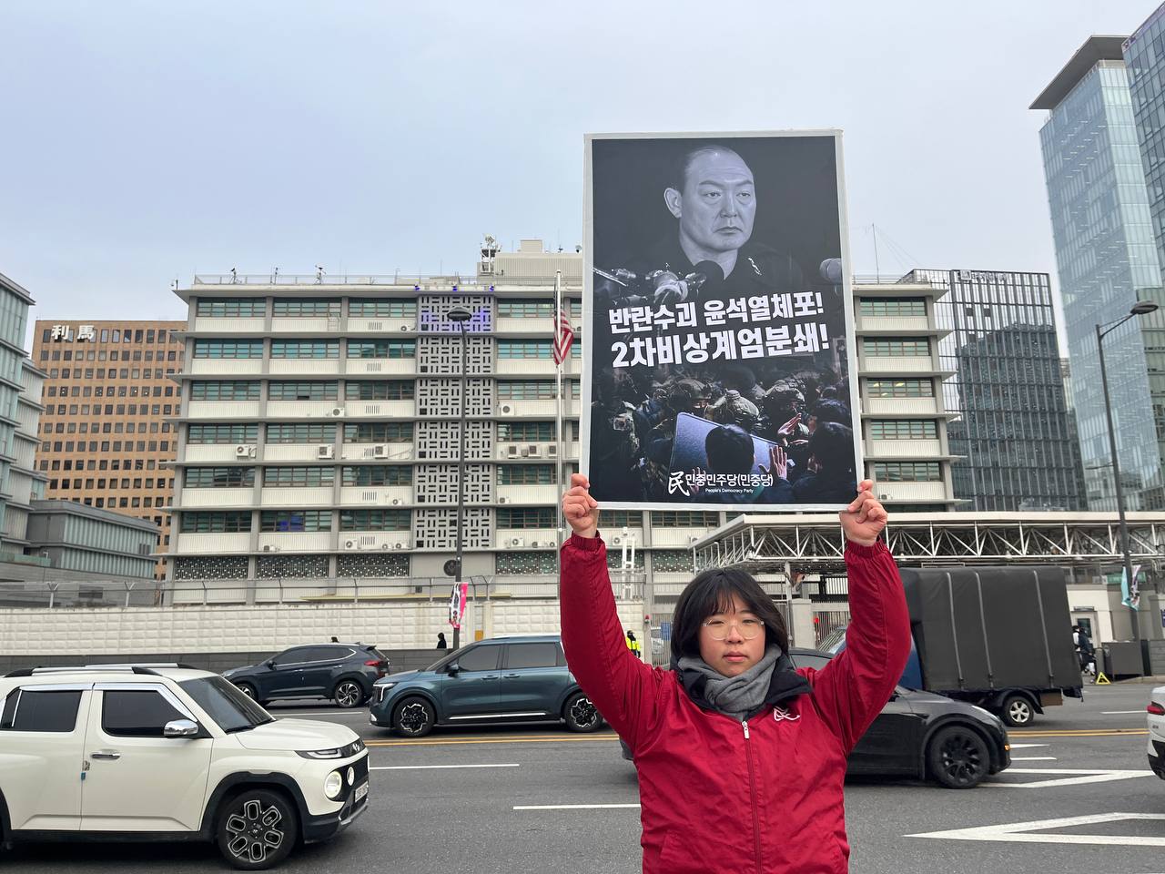 미대사관정문 맞은편에서는 우리말과 영어로 된 구호 <북침핵전쟁책동중단! 미군철거! 윤석열타도!>를 들고 <광화문미대사관앞철야시위>를 진행했다. <김병동석방! 윤석열타도!>, <친위쿠데타 반란수괴 윤석열체포!> 구호도 함께 들었다.