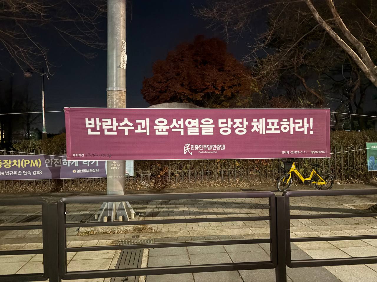 정당연설회 민중민주당, 13일 수도권 〈반란수괴 윤석열 당장체포!〉가로막게시 2024년 12월 14일 FacebookTwitter 13일 민중민주당(민중당)은 경기 광명시민회관앞·광명경찰서앞·운양역앞·일산호수공원·일산동구청앞, 서울 금천패션아울렛앞·구로디지털단지역앞, 인천지방법원앞에 <반란수괴 윤석열을 당장 체포하라!> 구호의 가로막을 내걸었다.