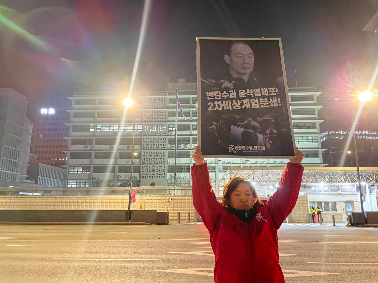 미대사관정문 맞은편에서는 우리말과 영어로 된 구호 <북침핵전쟁책동중단! 미군철거! 윤석열타도!>를 들고 <광화문미대사관앞철야시위>를 진행했다. <김병동석방! 윤석열타도!>, <친위쿠데타 반란수괴 윤석열체포!> 구호도 함께 들었다.