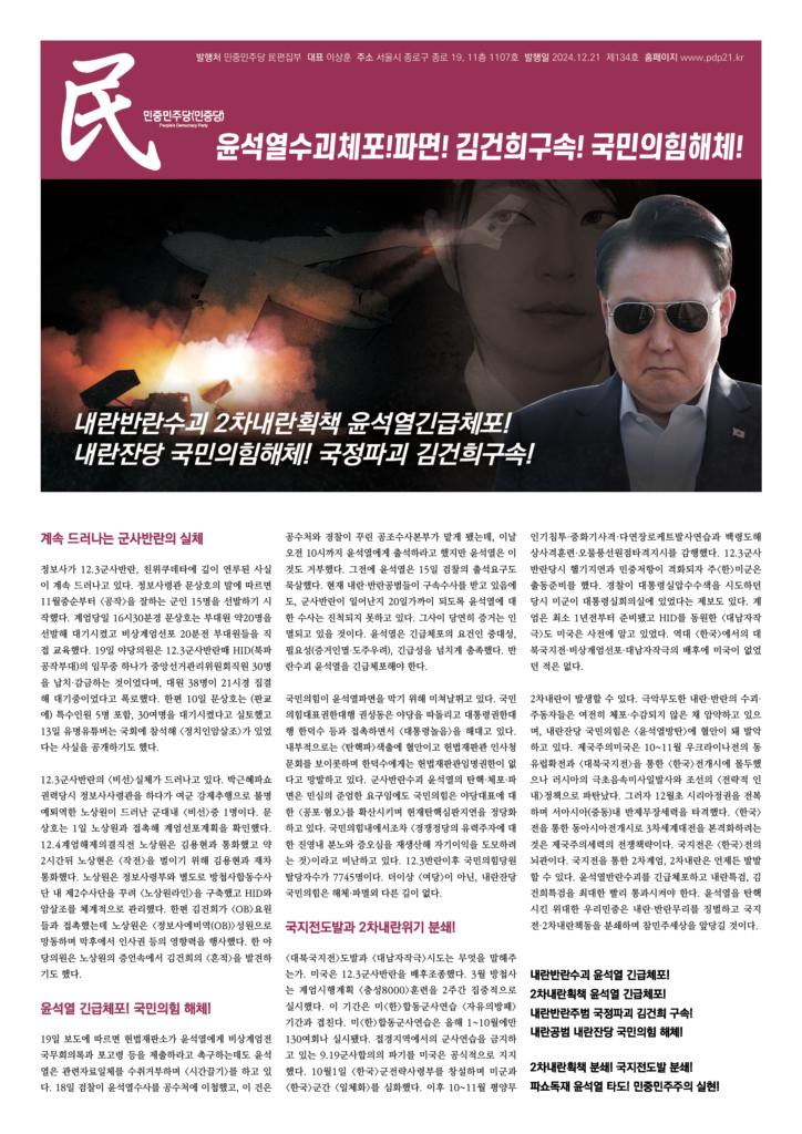 2차내란이 발생할 수 있다. 극악무도한 내란·반란의 수괴·주동자들은 여전히 체포·수감되지 않은 채 암약하고 있으며, 내란잔당 국민의힘은 <윤석열방탄>에 혈안이 돼 발악하고 있다. 제국주의미국은 10~11월 우크라이나전의 동유럽확전과 <대북국지전>을 통한 <한국>전개시에 몰두했으나 러시아의 극초음속미사일발사와 조선의 <전략적 인내>정책으로 파탄났다. 그러자 12월초 시리아정권을 전복하며 서아시아(중동)내 반제무장세력을 타격했다. <한국>전을 통한 동아시아전개시로 3차세계대전을 본격화하려는 것은 제국주의세력의 전쟁책략이다. 국지전은 <한국>전의 뇌관이다. 국지전을 통한 2차계엄, 2차내란은 언제든 발발할 수 있다. 윤석열반란수괴를 긴급체포하고 내란특검, 김건희특검을 최대한 빨리 통과시켜야 한다. 윤석열을 탄핵시킨 위대한 우리민중은 내란·반란무리를 징벌하고 국지전·2차내란책동을 분쇄하며 참민주세상을 앞당길 것이다.