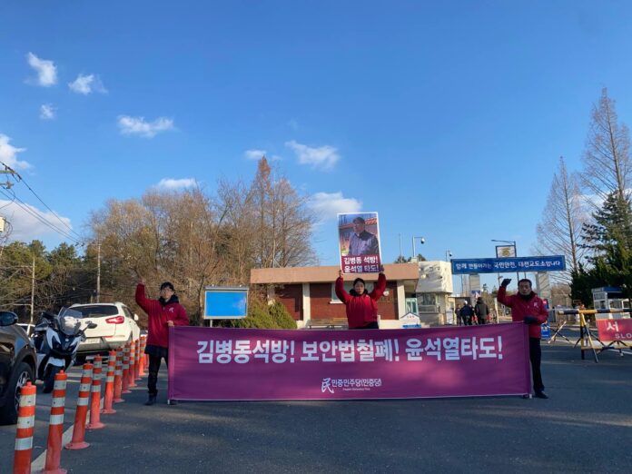 18일 민중민주당(민중당)은 대전교도소앞에서 <김병동석방! 보안법철폐! 윤석열타도!> 구호의 가로막을 펼치고 정당연설회를 진행했다.