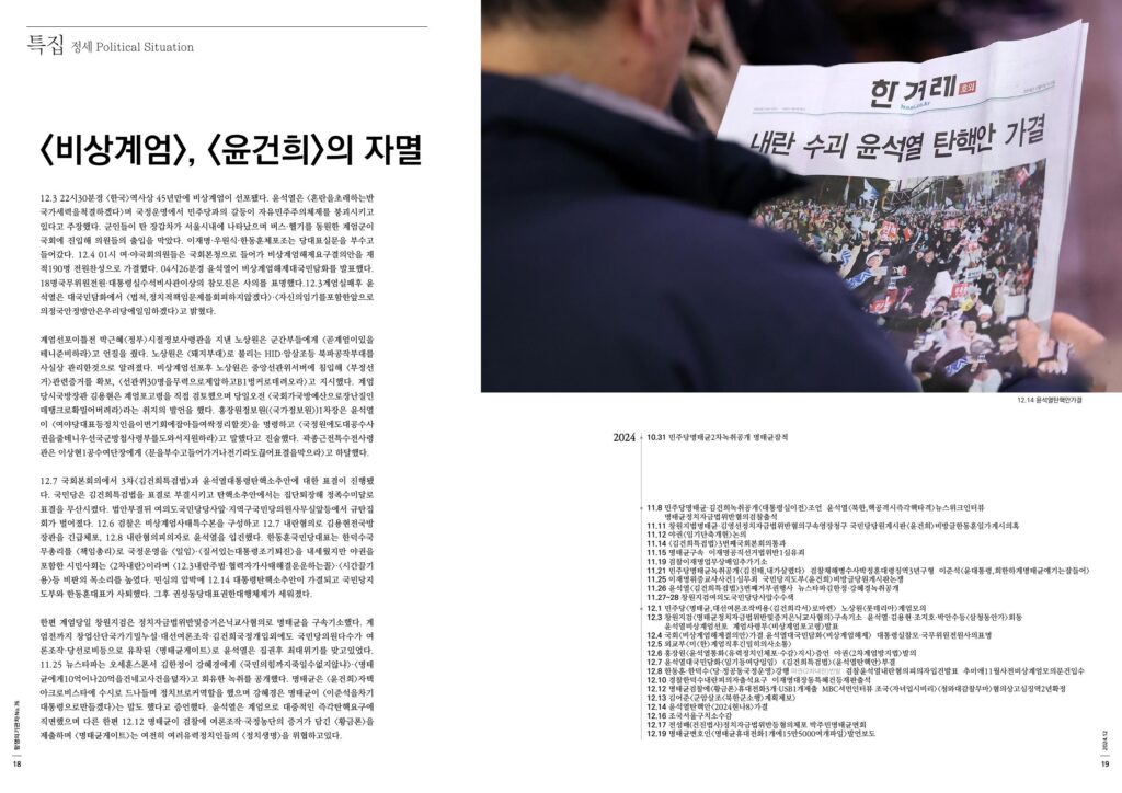12.3 22시30분경 <한국>역사상 45년만에 비상계엄이 선포됐다. 윤석열은 <혼란을초래하는반국가세력을척결하겠다>며 국정운영에서 민주당과의 갈등이 자유민주주의체제를 붕괴시키고있다고 주장했다. 군인들이 탄 장갑차가 서울시내에 나타났으며 버스·헬기를 동원한 계엄군이 국회에 진입해 의원들의 출입을 막았다. 이재명·우원식·한동훈체포조는 당대표실문을 부수고 들어갔다. 12.4 01시 여·야국회의원들은 국회본청으로 들어가 비상계엄해제요구결의안을 재적190명 전원찬성으로 가결했다. 04시26분경 윤석열이 비상계엄해제대국민담화를 발표했다. 18명국무위원전원·대통령실수석비사관이상의 참모진은 사의를 표명했다.12.3계엄실패후 윤석열은 대국민담화에서 <법적,정치적책임문제를회피하지않겠다>·<자신의임기를포함한앞으로의정국안정방안은우리당에일임하겠다>고 밝혔다.