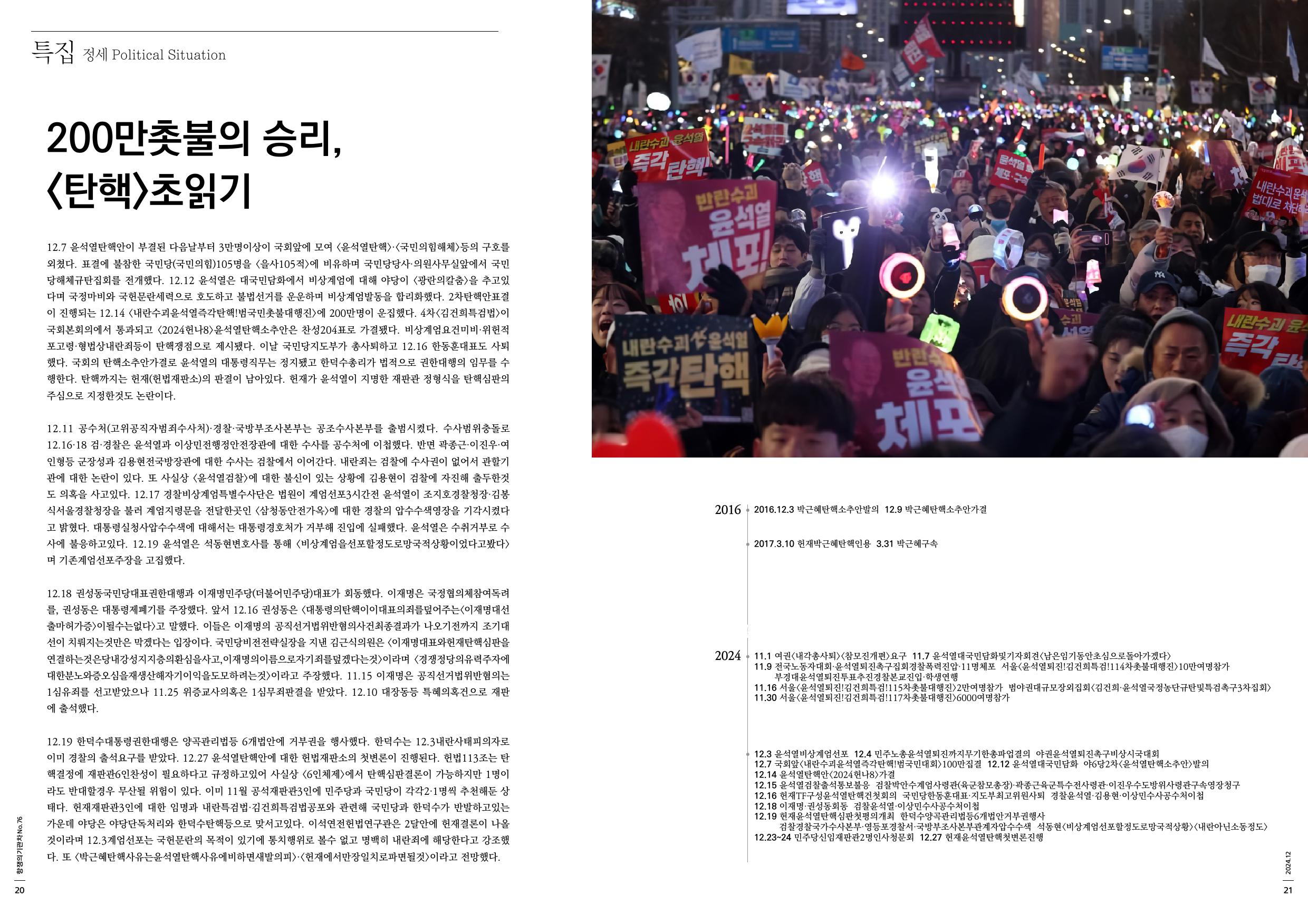 12.7 윤석열탄핵안이 부결된 다음날부터 3만명이상이 국회앞에 모여 <윤석열탄핵>·<국민의힘해체>등의 구호를 외쳤다. 표결에 불참한 국민당(국민의힘)105명을 <을사105적>에 비유하며 국민당당사·의원사무실앞에서 국민당해체규탄집회를 전개했다. 12.12 윤석열은 대국민담화에서 비상계엄에 대해 야당이 <광란의칼춤>을 추고있다며 국정마비와 국헌문란세력으로 호도하고 불법선거를 운운하며 비상계엄발동을 합리화했다. 2차탄핵안표결이 진행되는 12.14 <내란수괴윤석열즉각탄핵!범국민촛불대행진>에 200만명이 운집했다. 4차<김건희특검법>이 국회본회의에서 통과되고 <2024헌나8>윤석열탄핵소추안은 찬성204표로 가결됐다. 비상계엄요건미비·위헌적포고령·형법상내란죄등이 탄핵쟁점으로 제시됐다. 이날 국민당지도부가 총사퇴하고 12.16 한동훈대표도 사퇴했다. 국회의 탄핵소추안가결로 윤석열의 대통령직무는 정지됐고 한덕수총리가 법적으로 권한대행의 임무를 수행한다. 탄핵까지는 헌재(헌법재판소)의 판결이 남아있다. 헌재가 윤석열이 지명한 재판관 정형식을 탄핵심판의 주심으로 지정한것도 논란이다.