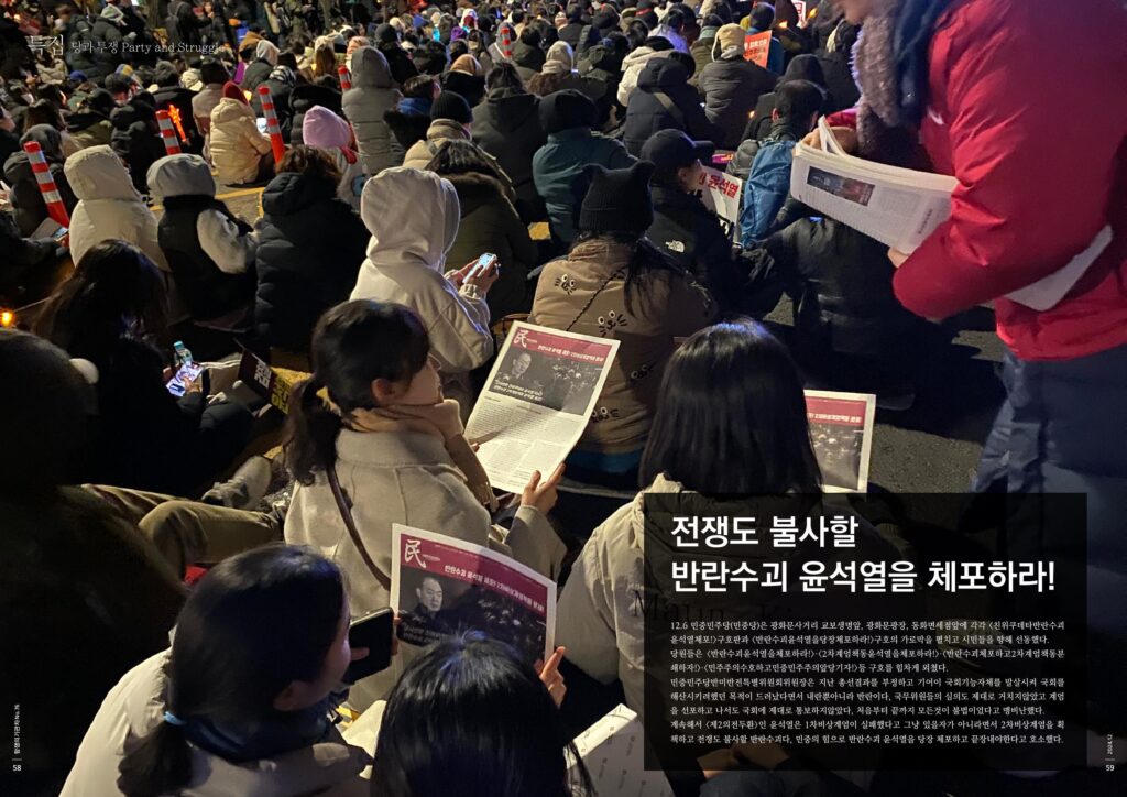 12.6 민중민주당(민중당)은 광화문사거리 교보생명앞, 광화문광장, 동화면세점앞에 각각 <친위쿠데타반란수괴윤석열체포!>구호판과 <반란수괴윤석열을당장체포하라!>구호의 가로막을 펼치고 시민들을 향해 선동했다.