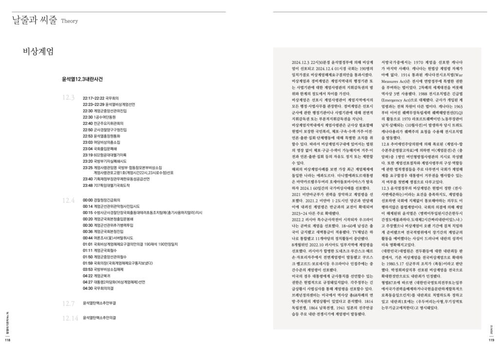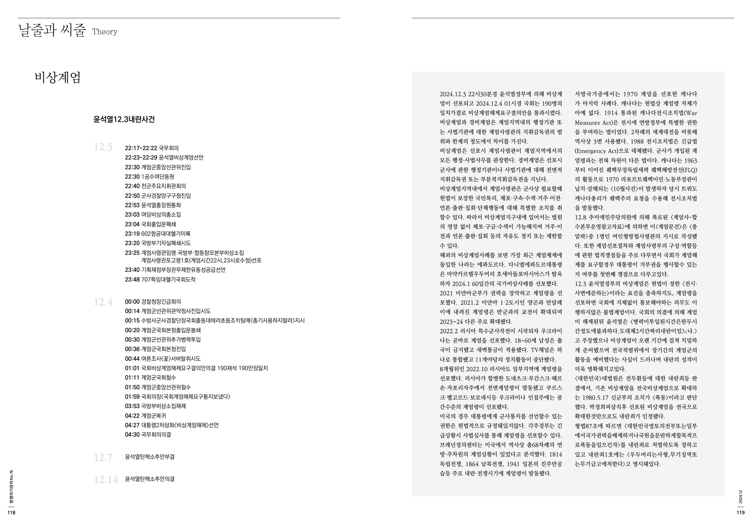 12.3 윤석열정부의 비상계엄은 헌법이 정한 <전시·사변에준하는>이라는 요건을 충족하지도, 계엄령을 선포하면 국회에 지체없이 통보해야하는 의무도 이행하지않은 불법계엄이다. 국회의 의결에 의해 계엄이 해제된뒤 윤석열은 <병력이투입된시간은한두시간정도에불과하다.도대체2시간짜리내란이있느냐.>고 주장했으나 비상계엄이 오랜 기간에 걸쳐 치밀하게 준비됐으며 전국적범위에서 장기간의 계엄군의 활동을 예비했다는 사실이 드러나며 내란의 성격이 더욱 명확해지고있다.