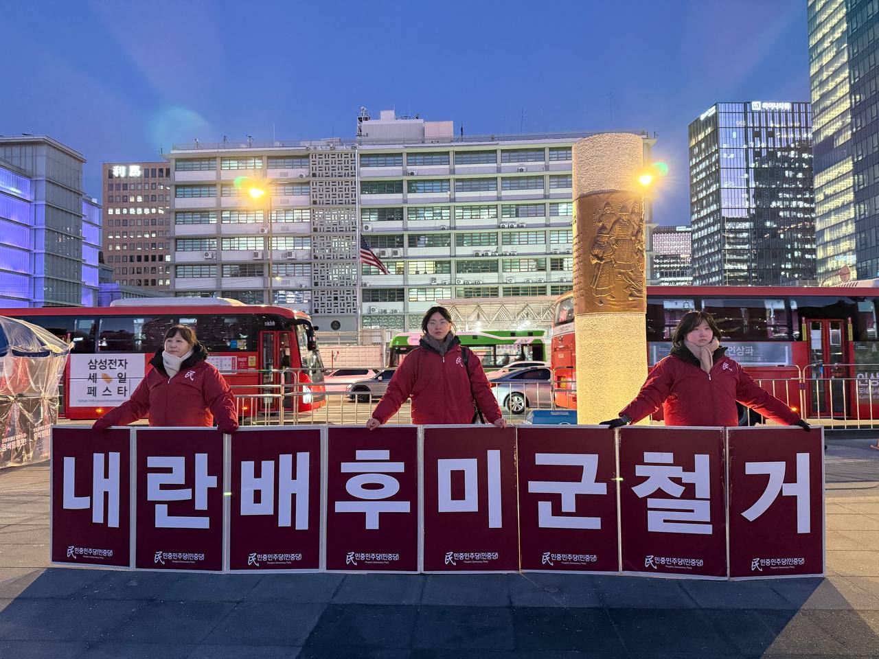 미대사관정문 맞은편에서는 우리말과 영어로 된 구호 <내란수괴 윤석열체포! 내란배후 미군철거!>를 들고 <광화문미대사관앞철야시위>를 진행했다. <김병동석방! 윤석열타도!>, <내란수괴 윤석열체포! 자작극 국지전 2차내란 분쇄!>, <내란수괴 윤석열체포! 내란배후 미군철거!> 구호도 함께 들었다.