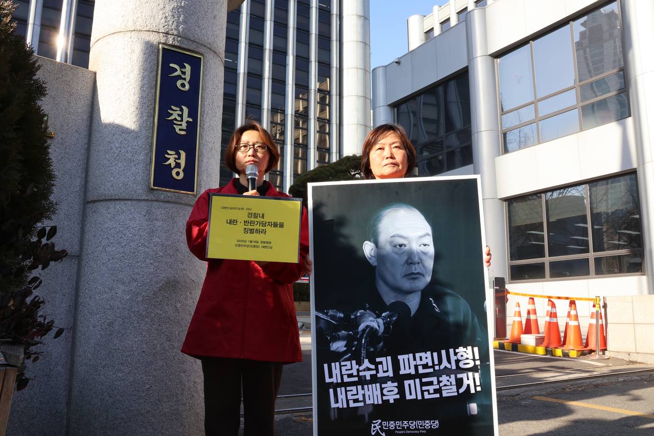 18일 민중민주당(민중당)은 경찰청앞에서 논평 <경찰내 내란·반란가담자들을 징벌하라>를 발표했다.