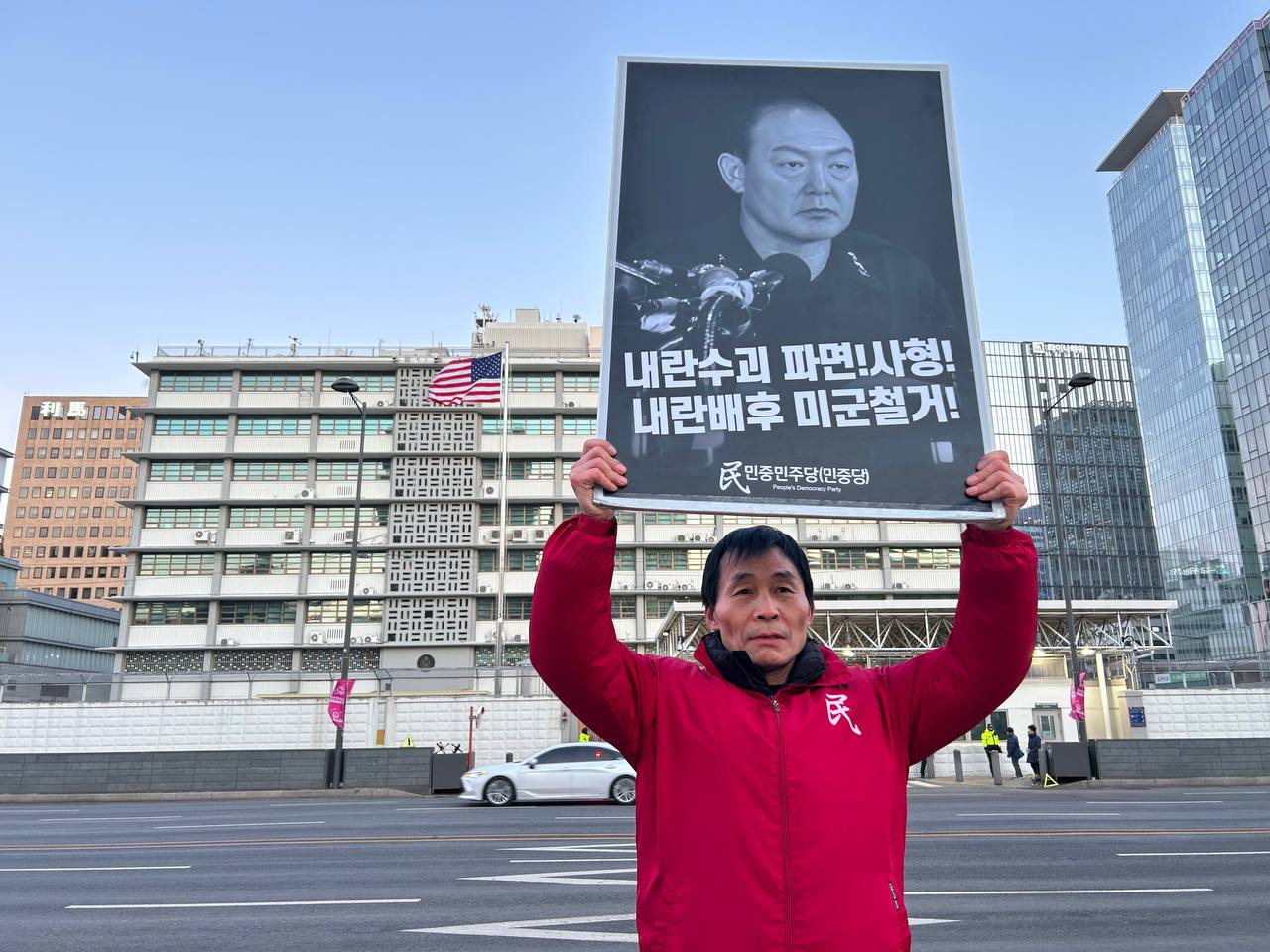 29일 민중민주당(민중당)은 미대사관앞에서 <내란수괴 파면!사형! 내란배후 미군철거!> 구호를 들고 평화시위를 3115일째 전개했다.