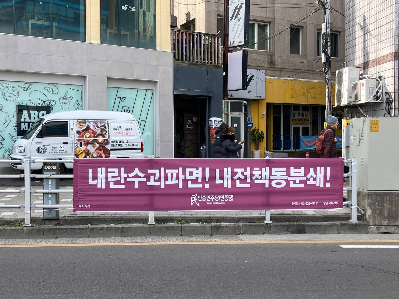 정당연설회 민중민주당 31일 제주 〈내란수괴파면! 내전책동분쇄!〉 가로막게시 2025년 1월 31일 FacebookTwitter 31일 민중민주당(민중당)은 제주 제주시청앞·노헝오거리에 <내란수괴파면! 내전책동분쇄!> 구호의 가로막을 게시했다.