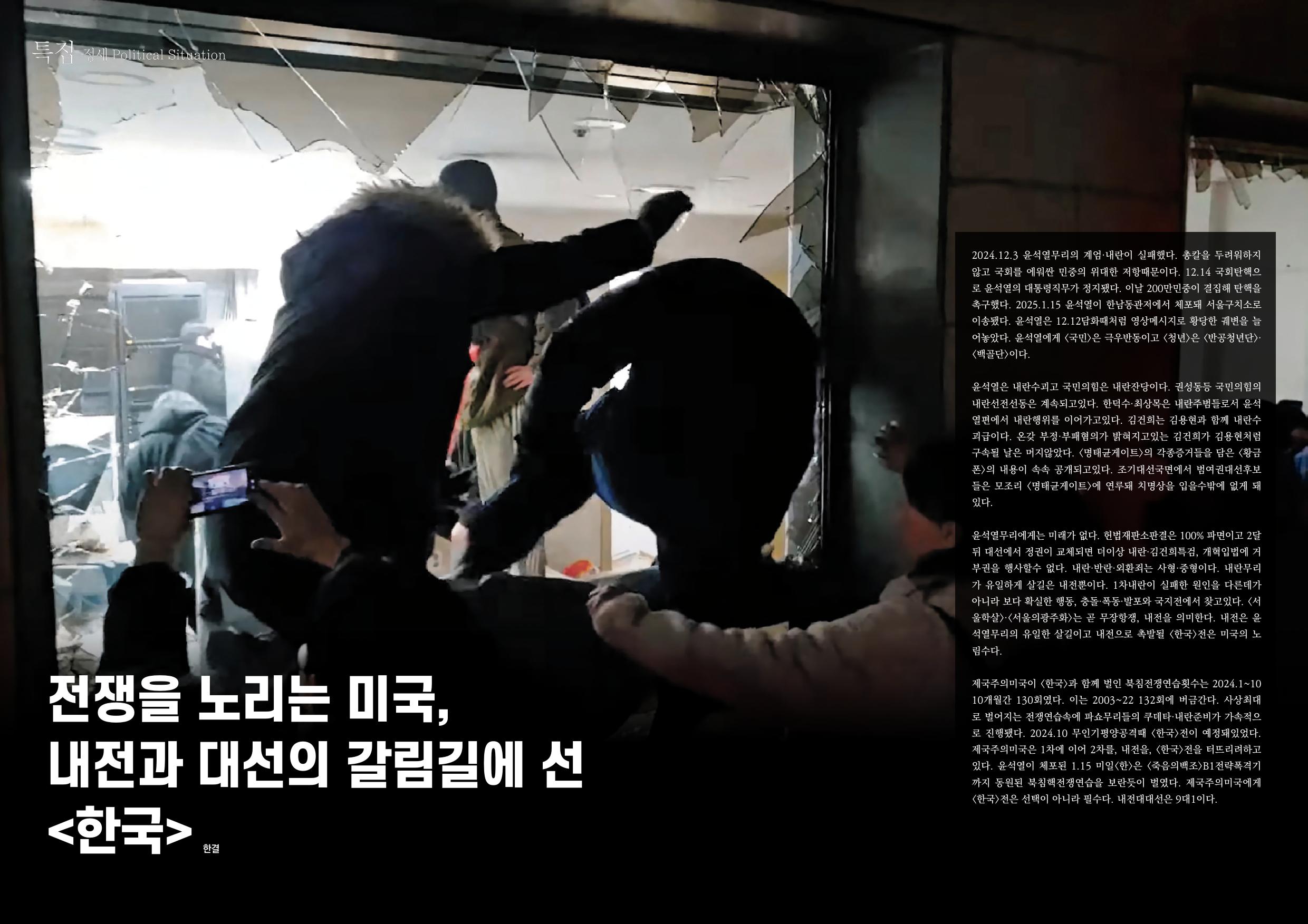 2024.12.3 윤석열무리의 계엄·내란이 실패했다. 총칼을 두려워하지않고 국회를 에워싼 민중의 위대한 저항때문이다. 12.14 국회탄핵으로 윤석열의 대통령직무가 정지됐다. 이날 200만민중이 결집해 탄핵을 촉구했다. 2025.1.15 윤석열이 한남동관저에서 체포돼 서울구치소로 이송됐다. 윤석열은 12.12담화때처럼 영상메시지로 황당한 궤변을 늘어놓았다. 윤석열에게 <국민>은 극우반동이고 <청년>은 <반공청년단>·<백골단>이다.