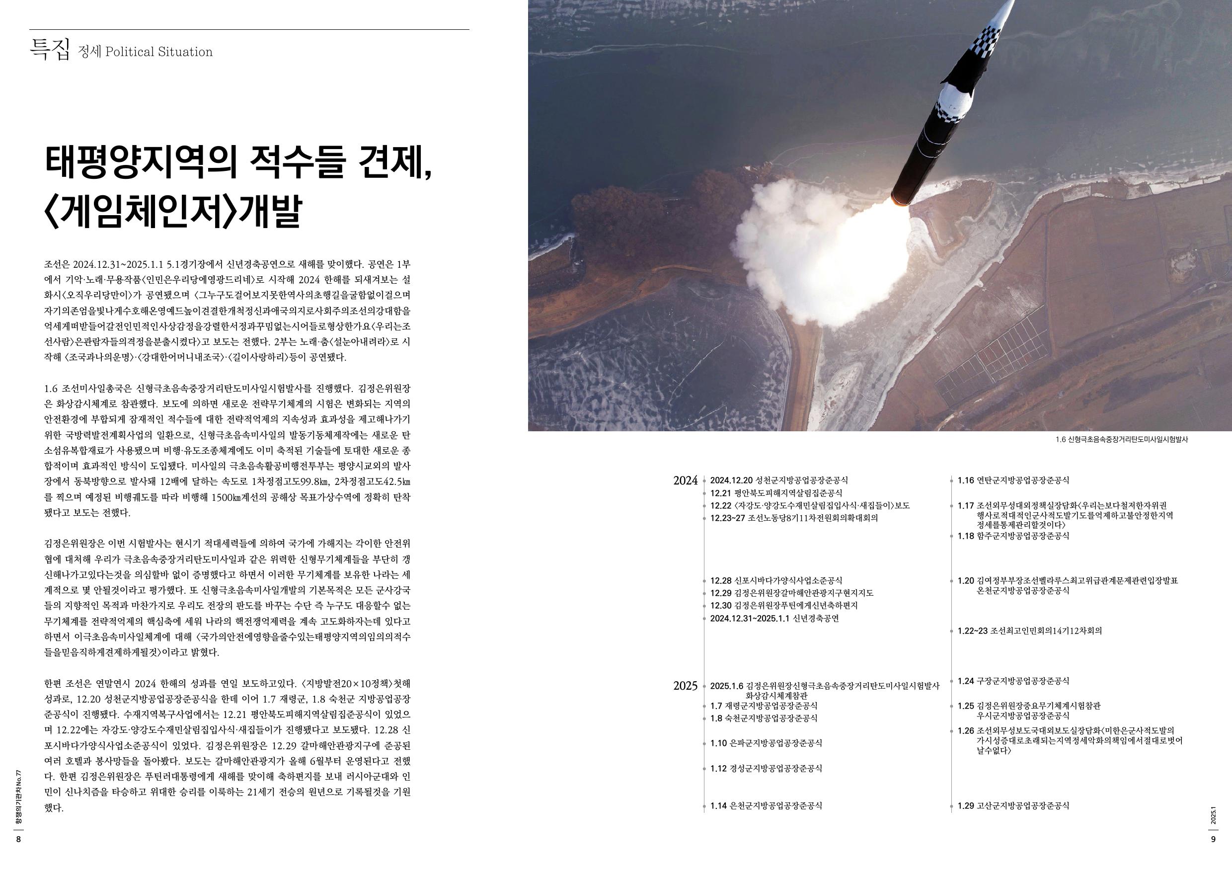 1.6 조선미사일총국은 신형극초음속중장거리탄도미사일시험발사를 진행했다. 김정은위원장은 화상감시체계로 참관했다. 보도에 의하면 새로운 전략무기체계의 시험은 변화되는 지역의 안전환경에 부합되게 잠재적인 적수들에 대한 전략적억제의 지속성과 효과성을 제고해나가기 위한 국방력발전계획사업의 일환으로, 신형극초음속미사일의 발동기동체제작에는 새로운 탄소섬유복합재료가 사용됐으며 비행·유도조종체계에도 이미 축적된 기술들에 토대한 새로운 종합적이며 효과적인 방식이 도입됐다. 미사일의 극초음속활공비행전투부는 평양시교외의 발사장에서 동북방향으로 발사돼 12배에 달하는 속도로 1차정점고도99.8㎞, 2차정점고도42.5㎞를 찍으며 예정된 비행궤도를 따라 비행해 1500㎞계선의 공해상 목표가상수역에 정확히 탄착됐다고 보도는 전했다.