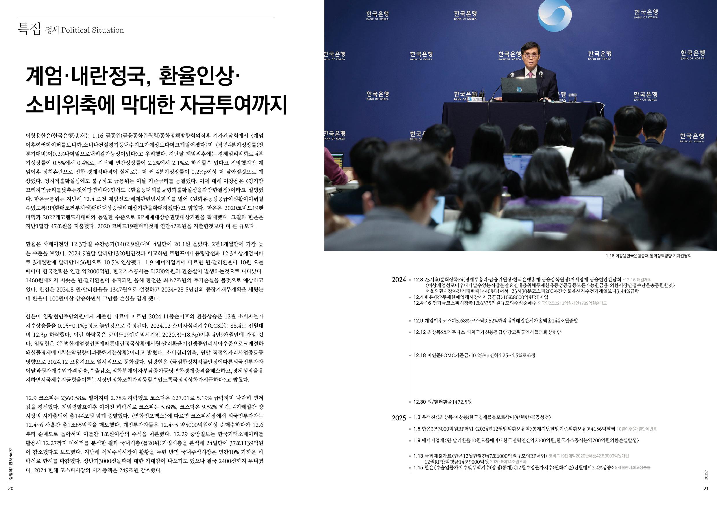 이창용한은(한국은행)총재는 1.16 금통위(금융통화위원회)통화정책방향회의직후 기자간담회에서 <계엄이후여러데이터를보니까,소비나건설경기등내수지표가예상보다더크게떨어졌다>며 <작년4분기성장률(전분기대비)이0.2%나더밑으로내려갈가능성이있다>고 우려했다. 지난달 계엄직후에는 경제심리악화로 4분기성장률이 0.5%에서 0.4%로, 지난해 연간성장률이 2.2%에서 2.1%로 하락할수 있다고 전망했지만 계엄이후 정치혼란으로 인한 경제적타격이 실제로는 더 커 4분기성장률이 0.2%p이상 더 낮아질것으로 예상했다. 정치적불확실성에도 불구하고 금통위는 이날 기준금리를 동결했다. 이에 대해 이창용은 <경기만고려하면금리를낮추는것이당연하다>면서도 <환율등대외불균형과불확실성을감안한결정>이라고 설명했다. 한은금통위는 지난해 12.4 오전 계엄선포·해제관련임시회의를 열어 <원화유동성공급이원활이이뤄질수있도록RP(환매조건부채권)매매대상증권과대상기관을확대하겠다>고 밝혔다. 한은은 2020코비드19팬더믹과 2022레고랜드사태때와 동일한 수준으로 RP매매대상증권및대상기관을 확대했다. 그결과 한은은 지난1달간 47조원을 지출했다. 2020 코비드19팬더믹첫해 연간42조원을 지출한것보다 더 큰 규모다.