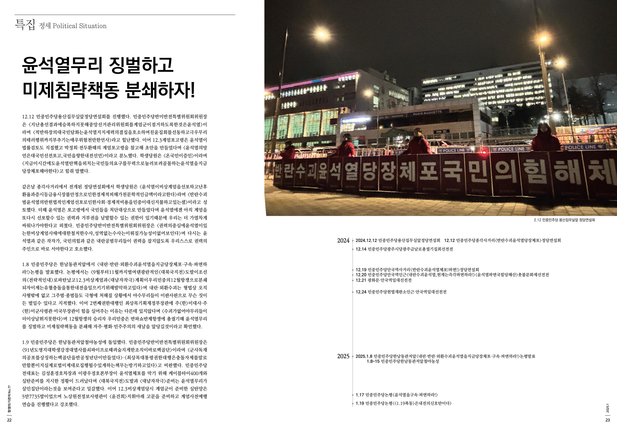 1.9 민중민주당은 한남동관저앞철야농성에 돌입했다. 민중민주당반미반전특별위원회위원장은 <91년도명지대학생강경대열사를쇠파이프로때려숨지게한조직이바로백골단>이라며 <군사독재의공포를상징하는백골단을반공청년단이만들었다>·<최상목대통령권한대행은충돌자제를말로만할뿐이지실제로법이제대로집행될수있게하는책무는방기하고있다>고 비판했다. 민중민주당전대표는 김성훈경호차장과 이광우경호본부장이 윤석열체포를 막기 위해 케이블타이400개와 실탄준비를 지시한 정황이 드러났다며 <대북국지전>도발과 <대남자작극>준비는 윤석열무리가 살인집단이라는것을 보여준다고 일갈했다. 이어 12.3비상계엄당시 계엄군이 준비한 실탄양은 5만7735발이었으며 노상원전정보사령관이 <윤건희>지휘아래 고문을 준비하고 계엄사전예행연습을 진행했다고 강조했다.