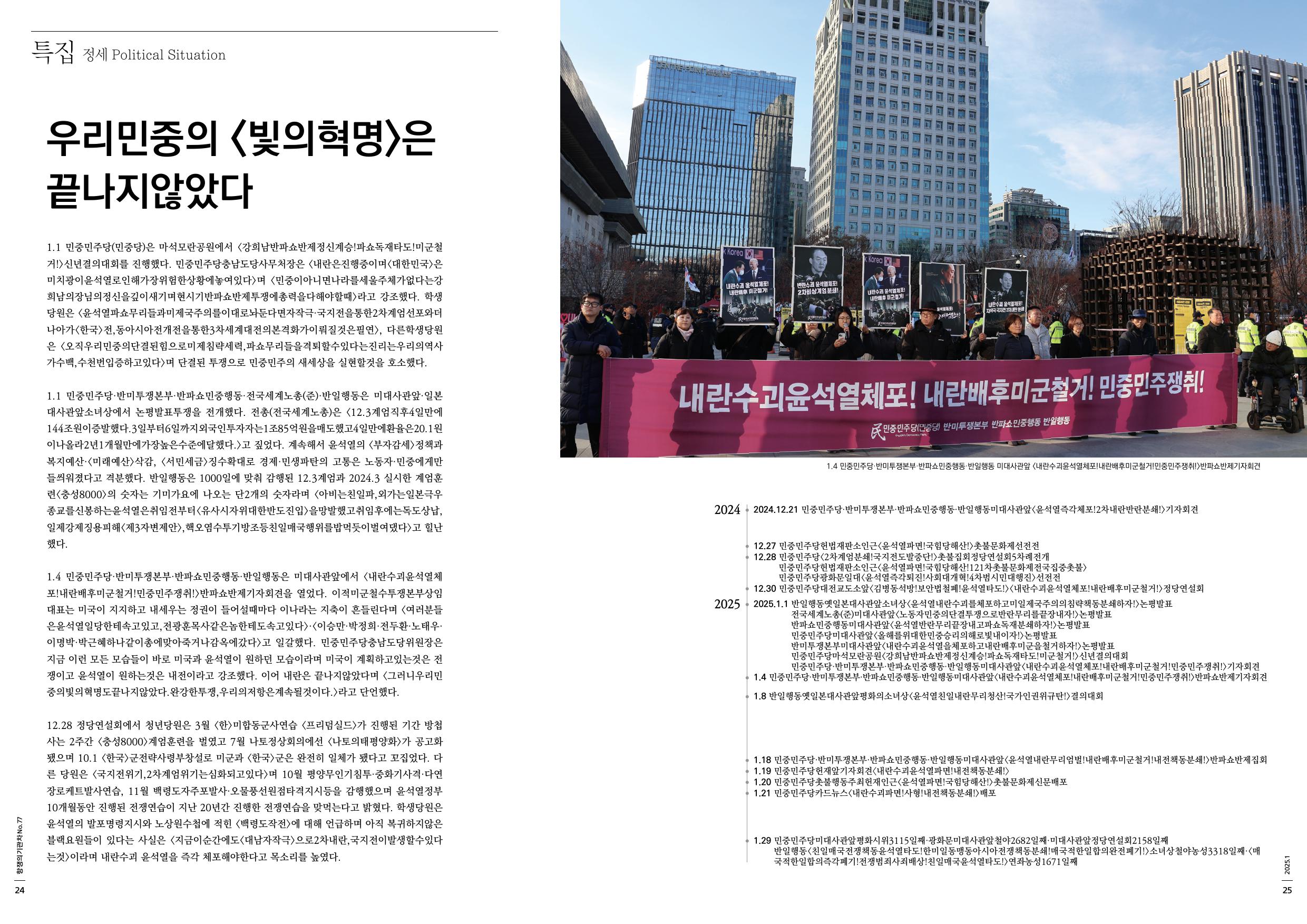 1.1 민중민주당(민중당)은 마석모란공원에서 <강희남반파쇼반제정신계승!파쇼독재타도!미군철거!>신년결의대회를 진행했다. 민중민주당충남도당사무처장은 <내란은진행중이며<대한민국>은미치광이윤석열로인해가장위험한상황에놓여있다>며 <민중이아니면나라를세울주체가없다는강희남의장님의정신을깊이새기며현시기반파쇼반제투쟁에총력을다해야할때>라고 강조했다. 학생당원은 <윤석열파쇼무리들과미제국주의를이대로놔둔다면자작극·국지전을통한2차계엄선포와더나아가<한국>전,동아시아전개전을통한3차세계대전의본격화가이뤄질것은필연>, 다른학생당원은 <오직우리민중의단결된힘으로미제침략세력,파쇼무리들을격퇴할수있다는진리는우리의역사가수백,수천번입증하고있다>며 단결된 투쟁으로 민중민주의 새세상을 실현할것을 호소했다.