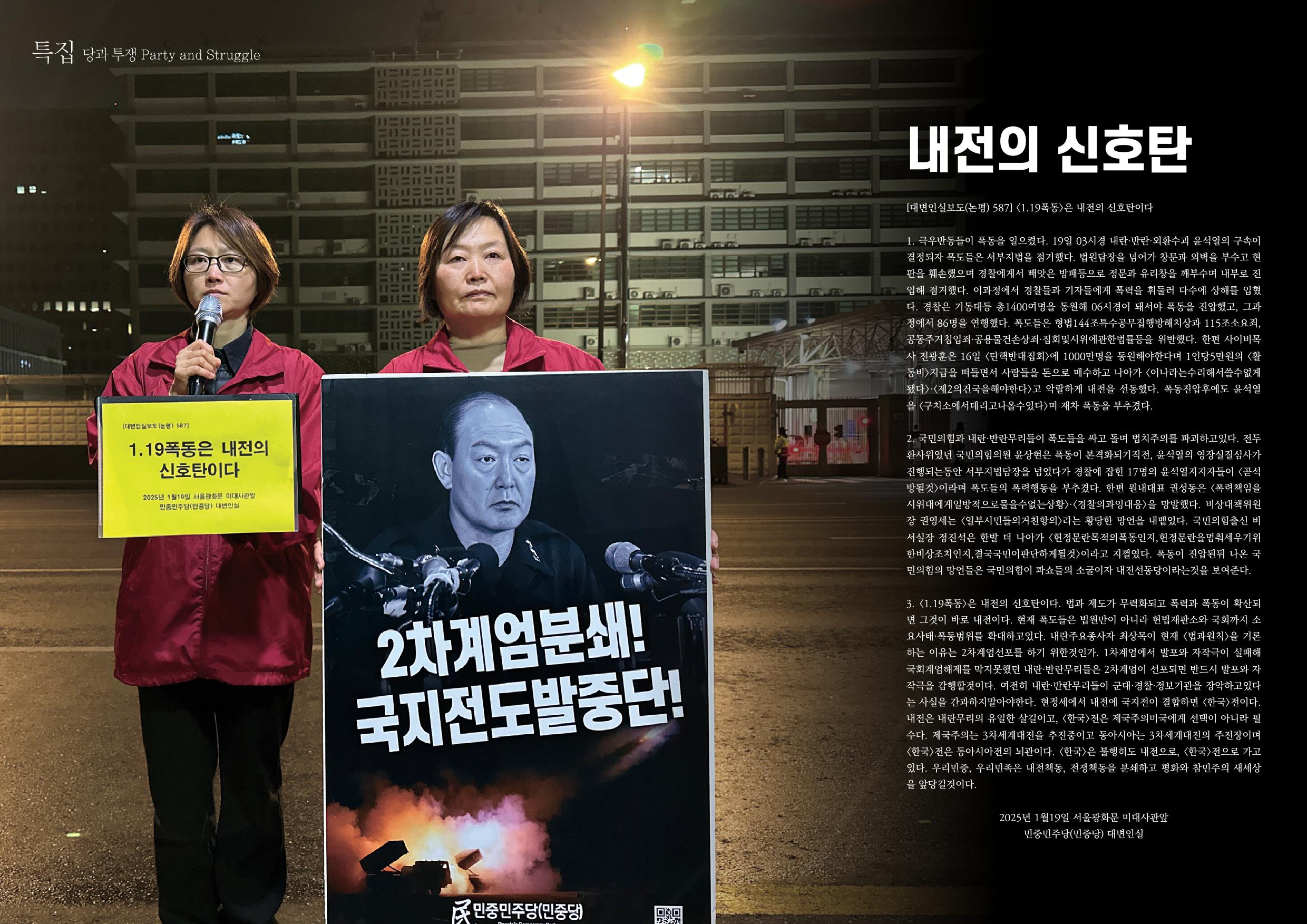 3. <1.19폭동>은 내전의 신호탄이다. 법과 제도가 무력화되고 폭력과 폭동이 확산되면 그것이 바로 내전이다. 현재 폭도들은 법원만이 아니라 헌법재판소와 국회까지 소요사태·폭동범위를 확대하고있다. 내란주요종사자 최상목이 현재 <법과원칙>을 거론하는 이유는 2차계엄선포를 하기 위한것인가. 1차계엄에서 발포와 자작극이 실패해 국회계엄해제를 막지못했던 내란·반란무리들은 2차계엄이 선포되면 반드시 발포와 자작극을 감행할것이다. 여전히 내란·반란무리들이 군대·경찰·정보기관을 장악하고있다는 사실을 간과하지말아야한다. 현정세에서 내전에 국지전이 결합하면 <한국>전이다. 내전은 내란무리의 유일한 살길이고, <한국>전은 제국주의미국에게 선택이 아니라 필수다. 제국주의는 3차세계대전을 추진중이고 동아시아는 3차세계대전의 주전장이며 <한국>전은 동아시아전의 뇌관이다. <한국>은 불행히도 내전으로, <한국>전으로 가고있다. 우리민중, 우리민족은 내전책동, 전쟁책동을 분쇄하고 평화와 참민주의 새세상을 앞당길것이다.