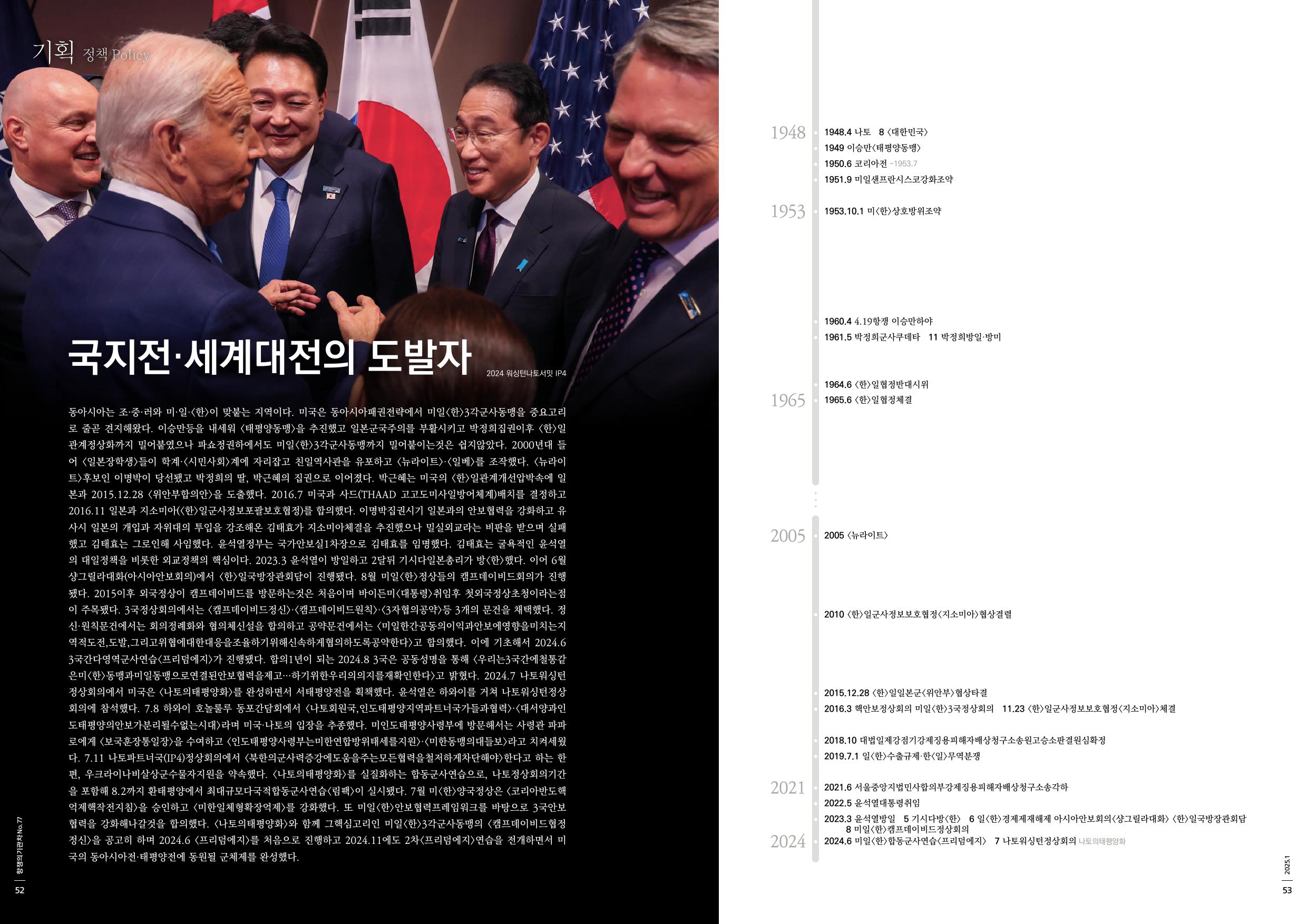 동아시아는 조·중·러와 미·일·<한>이 맞붙는 지역이다. 미국은 동아시아패권전략에서 미일<한>3각군사동맹을 중요고리로 줄곧 견지해왔다. 이승만등을 내세워 <태평양동맹>을 추진했고 일본군국주의를 부활시키고 박정희집권이후 <한>일관계정상화까지 밀어붙였으나 파쇼정권하에서도 미일<한>3각군사동맹까지 밀어붙이는것은 쉽지않았다. 2000년대 들어 <일본장학생>들이 학계·<시민사회>계에 자리잡고 친일역사관을 유포하고 <뉴라이트>·<일베>를 조작했다. <뉴라이트>후보인 이명박이 당선됐고 박정희의 딸, 박근혜의 집권으로 이어졌다. 박근혜는 미국의 <한>일관계개선압박속에 일본과 2015.12.28 <위안부합의안>을 도출했다. 2016.7 미국과 사드(THAAD 고고도미사일방어체계)배치를 결정하고 2016.11 일본과 지소미아(<한>일군사정보포괄보호협정)를 합의했다. 이명박집권시기 일본과의 안보협력을 강화하고 유사시 일본의 개입과 자위대의 투입을 강조해온 김태효가 지소미아체결을 추진했으나 밀실외교라는 비판을 받으며 실패했고 김태효는 그로인해 사임했다. 윤석열정부는 국가안보실1차장으로 김태효를 임명했다. 김태효는 굴욕적인 윤석열의 대일정책을 비롯한 외교정책의 핵심이다. 2023.3 윤석열이 방일하고 2달뒤 기시다일본총리가 방<한>했다. 이어 6월 샹그릴라대화(아시아안보회의)에서 <한>일국방장관회담이 진행됐다. 8월 미일<한>정상들의 캠프데이비드회의가 진행됐다. 2015이후 외국정상이 캠프데이비드를 방문하는것은 처음이며 바이든미<대통령>취임후 첫외국정상초청이라는점이 주목됐다. 3국정상회의에서는 <캠프데이비드정신>·<캠프데이비드원칙>·<3자협의공약>등 3개의 문건을 채택했다. 정신·원칙문건에서는 회의정례화와 협의체신설을 합의하고 공약문건에서는 <미일한간공동의이익과안보에영향을미치는지역적도전,도발,그리고위협에대한대응을조율하기위해신속하게협의하도록공약한다>고 합의했다. 이에 기초해서 2024.6