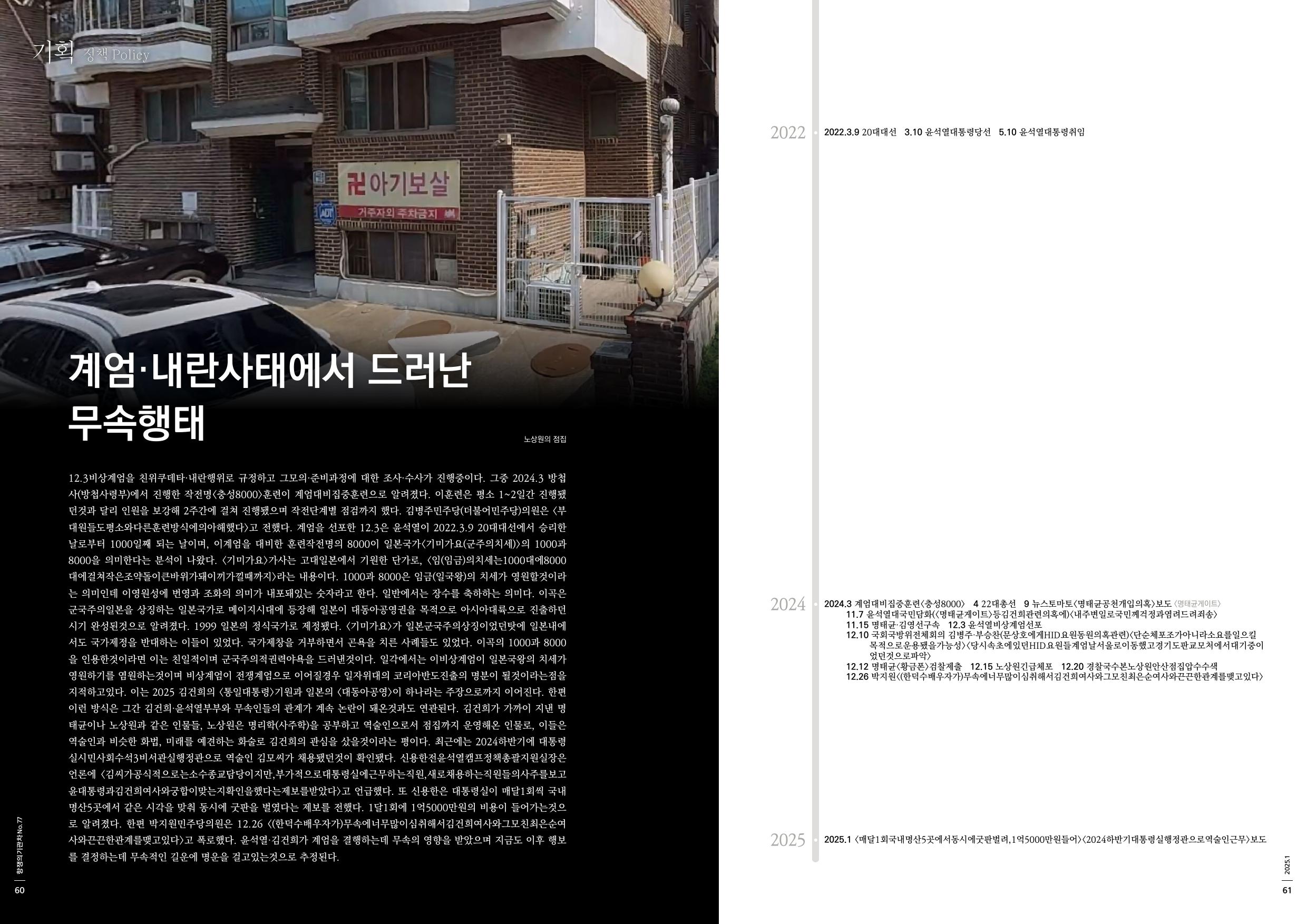 12.3비상계엄을 친위쿠데타·내란행위로 규정하고 그모의·준비과정에 대한 조사·수사가 진행중이다. 그중 2024.3 방첩사(방첩사령부)에서 진행한 작전명<충성8000>훈련이 계엄대비집중훈련으로 알려졌다. 이훈련은 평소 1~2일간 진행됐던것과 달리 인원을 보강해 2주간에 걸쳐 진행됐으며 작전단계별 점검까지 했다. 김병주민주당(더불어민주당)의원은 <부대원들도평소와다른훈련방식에의아해했다>고 전했다. 계엄을 선포한 12.3은 윤석열이 2022.3.9 20대대선에서 승리한 날로부터 1000일째 되는 날이며, 이계엄을 대비한 훈련작전명의 8000이 일본국가<기미가요(군주의치세)>의 1000과 8000을 의미한다는 분석이 나왔다. <기미가요>가사는 고대일본에서 기원한 단가로, <임(임금)의치세는1000대에8000대에걸쳐작은조약돌이큰바위가돼이끼가낄때까지>라는 내용이다. 1000과 8000은 임금(일국왕)의 치세가 영원할것이라는 의미인데 이영원성에 번영과 조화의 의미가 내포돼있는 숫자라고 한다. 일반에서는 장수를 축하하는 의미다. 이곡은 군국주의일본을 상징하는 일본국가로 메이지시대에 등장해 일본이 대동아공영권을 목적으로 아시아대륙으로 진출하던 시기 완성된것으로 알려졌다. 1999 일본의 정식국가로 제정됐다. <기미가요>가 일본군국주의상징이었던탓에 일본내에서도 국가제정을 반대하는 이들이 있었다. 국가제창을 거부하면서 곤욕을 치른 사례들도 있었다. 이곡의 1000과 8000을 인용한것이라면 이는 친일적이며 군국주의적권력야욕을 드러낸것이다. 일각에서는 이비상계엄이 일본국왕의 치세가 영원하기를 염원하는것이며 비상계엄이 전쟁계엄으로 이어질경우 일자위대의 코리아반도진출의 명분이 될것이라는점을 지적하고있다. 이는 2025 김건희의 <통일대통령>기원과 일본의 <대동아공영>이 하나라는 주장으로까지 이어진다. 한편 이런 방식은 그간 김건희·윤석열부부와 무속인들의 관계가 계속 논란이 돼온것과도 연관된다. 김건희가 가까이 지낸 명태균이나 노상원과 같은 인물들, 노상원은 명리학(사주학)을 공부하고 역술인으로서 점집까지 운영해온 인물로, 이들은 역술인과 비슷한 화법, 미래를 예견하는 화술로 김건희의 관심을 샀을것이라는 평이다. 최근에는 2024하반기에 대통령실시민사회수석3비서관실행정관으로 역술인 김모씨가 채용됐던것이 확인됐다. 신용한전윤석열캠프정책총괄지원실장은 언론에 <김씨가공식적으로는소수종교담당이지만,부가적으로대통령실에근무하는직원,새로채용하는직원들의사주를보고윤대통령과김건희여사와궁합이맞는지확인을했다는제보를받았다>고 언급했다. 또 신용한은 대통령실이 매달1회씩 국내명산5곳에서 같은 시각을 맞춰 동시에 굿판을 벌였다는 제보를 전했다. 1달1회에 1억5000만원의 비용이 들어가는것으로 알려졌다. 한편 박지원민주당의원은 12.26 <(한덕수배우자가)무속에너무많이심취해서김건희여사와그모친최은순여사와끈끈한관계를맺고있다>고 폭로했다. 윤석열·김건희가 계엄을 결행하는데 무속의 영향을 받았으며 지금도 이후 행보를 결정하는데 무속적인 길운에 명운을 걸고있는것으로 추정된다.
