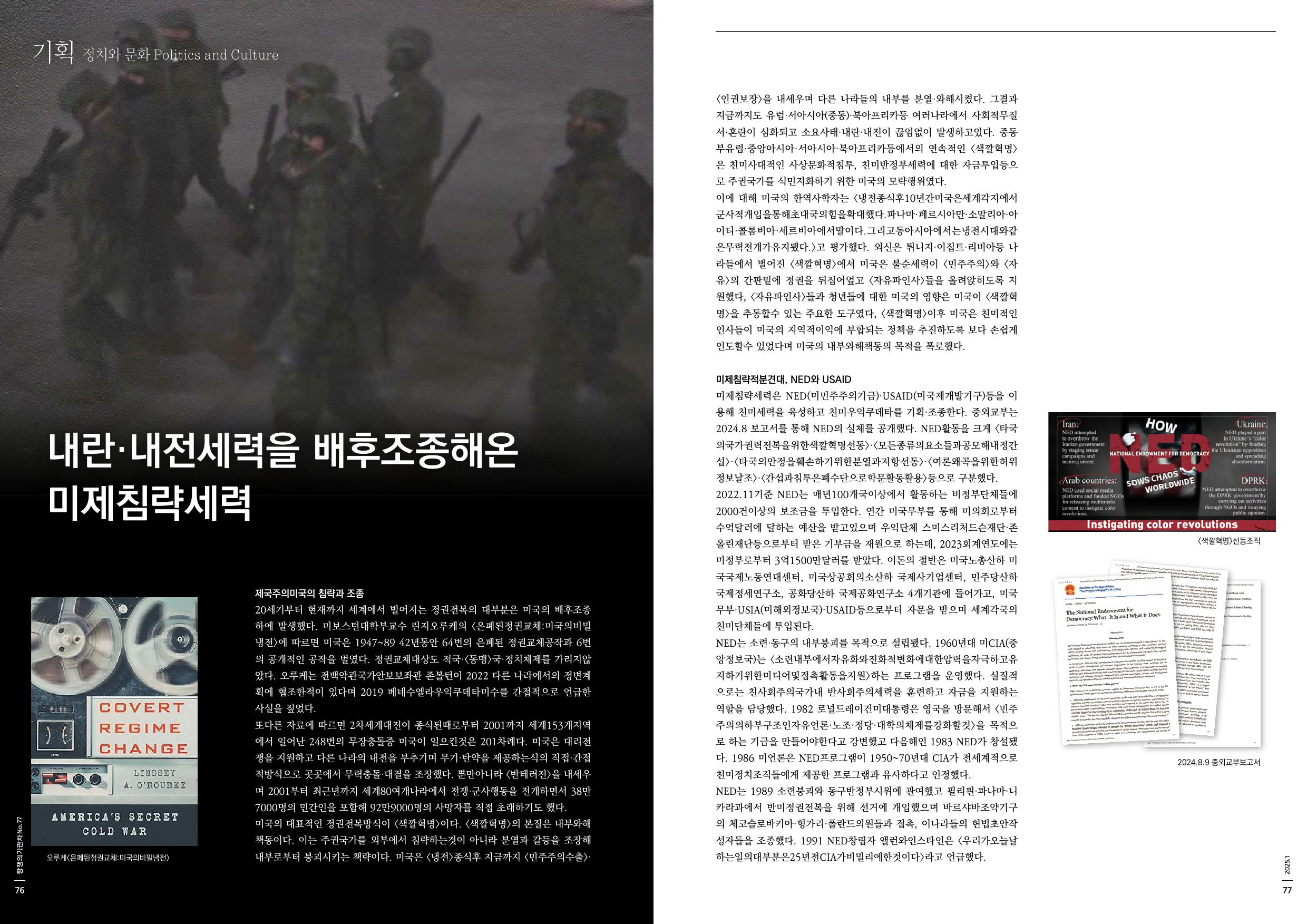 미제침략세력은 NED(미민주주의기금)·USAID(미국제개발기구)등을 이용해 친미세력을 육성하고 친미우익쿠데타를 기획·조종한다. 중외교부는 2024.8 보고서를 통해 NED의 실체를 공개했다. NED활동을 크게 <타국의국가권력전복을위한색깔혁명선동>·<모든종류의요소들과공모해내정간섭>·<타국의안정을훼손하기위한분열과저항선동>·<여론왜곡을위한허위정보날조>·<간섭과침투은폐수단으로학문활동활용>등으로 구분했다.
