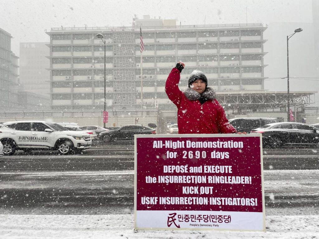 6일 민중민주당(민중당)은 미대사관앞에서 <내란수괴 파면!사형! 내란배후 미군철거!> 구호를 들고 평화시위를 3123일째 전개했다.