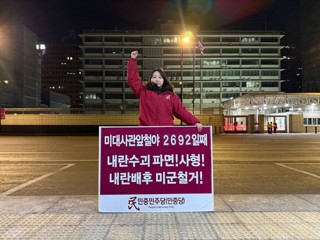 8일 민중민주당(민중당)은 미대사관앞에서 <내란수괴 파면!사형! 내란배후 미군철거!> 구호를 들고 평화시위를 3125일째 전개했다.