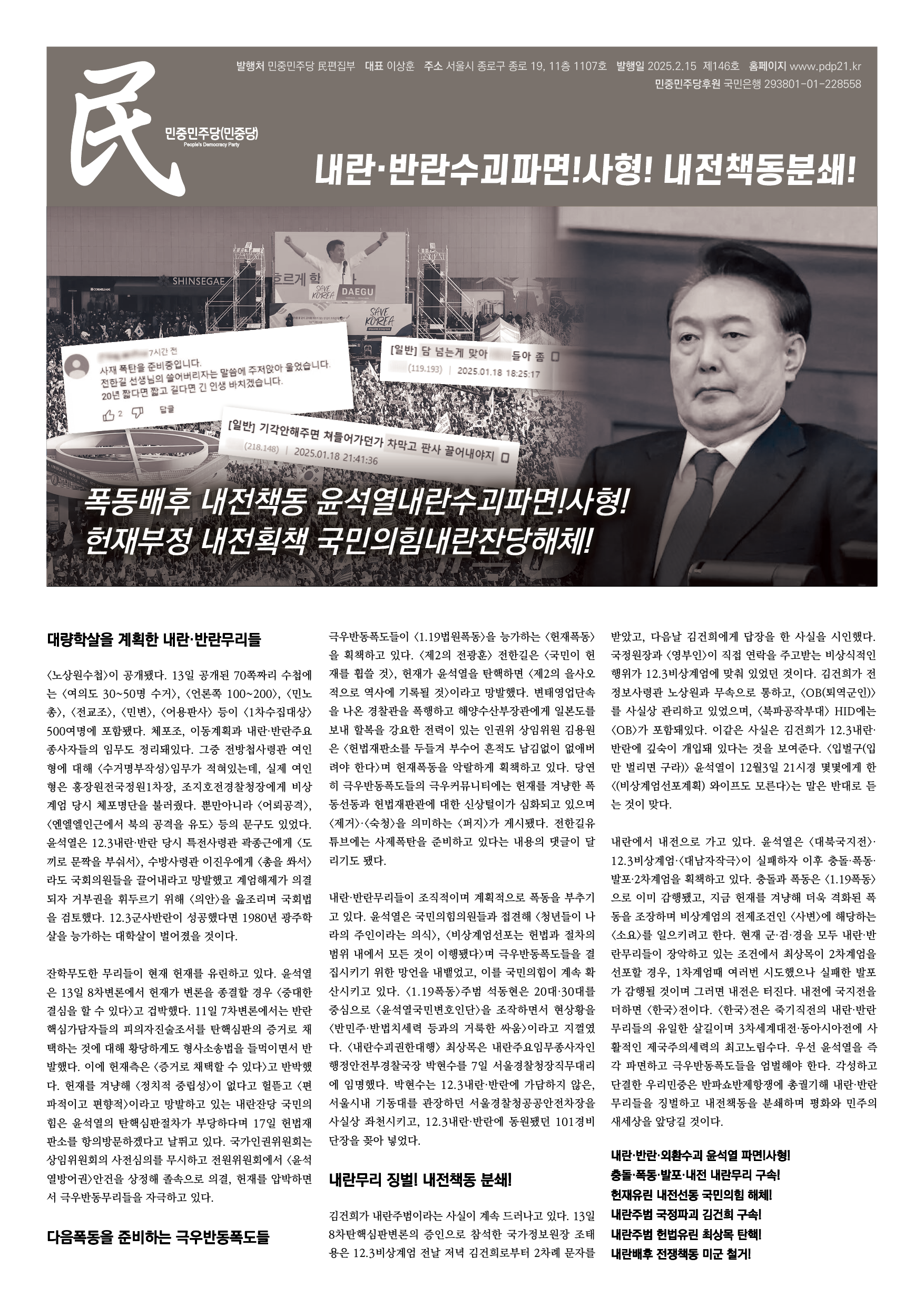 내란·반란무리들이 조직적이며 계획적으로 폭동을 부추기고 있다. 윤석열은 국민의힘의원들과 접견해 <청년들이 나라의 주인이라는 의식>, <비상계엄선포는 헌법과 절차의 범위 내에서 모든 것이 이행됐다>며 극우반동폭도들을 결집시키기 위한 망언을 내뱉었고, 이를 국민의힘이 계속 확산시키고 있다. <1.19폭동>주범 석동현은 20대·30대를 중심으로 <윤석열국민변호인단>을 조작하면서 현상황을 <반민주·반법치세력 등과의 거룩한 싸움>이라고 지껄였다. <내란수괴권한대행> 최상목은 내란주요임무종사자인 행정안전부경찰국장 박현수를 7일 서울경찰청장직무대리에 임명했다. 박현수는 12.3내란·반란에 가담하지 않은, 서울시내 기동대를 관장하던 서울경찰청공공안전차장을 사실상 좌천시키고, 12.3내란·반란에 동원됐던 101경비단장을 꽂아 넣었다.