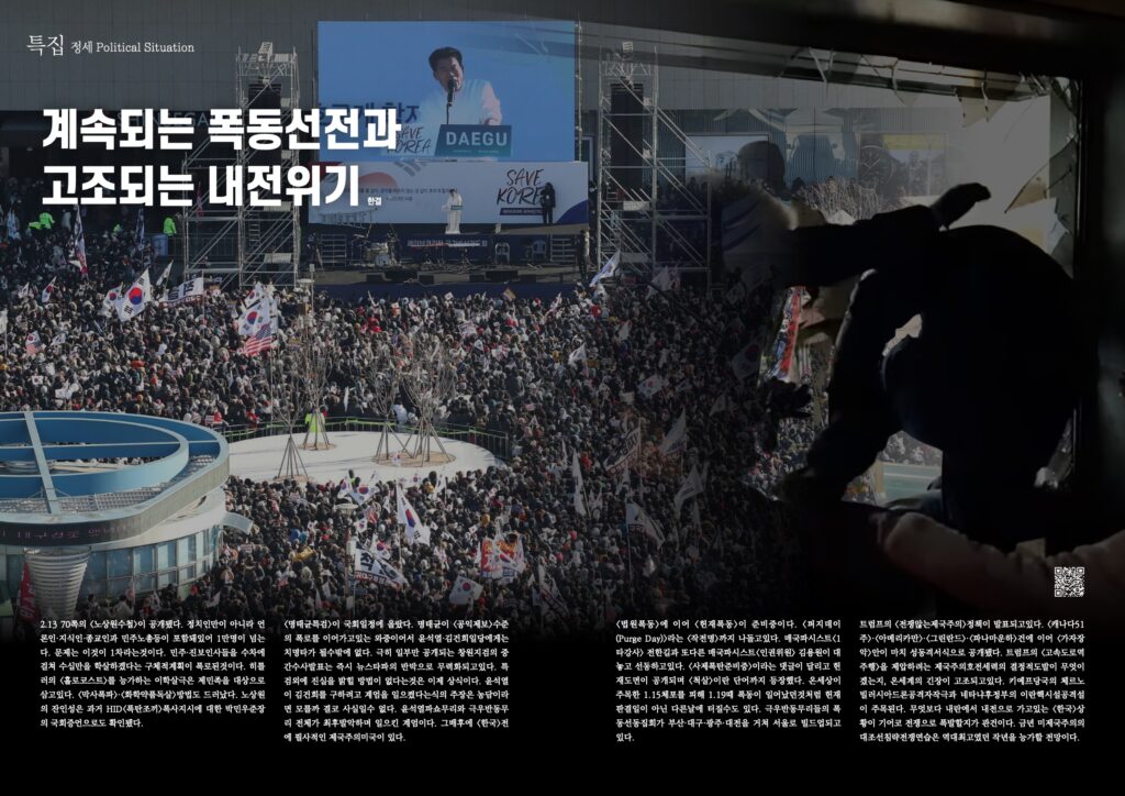 트럼프의 <전쟁않는제국주의>정책이 발표되고있다. <캐나다51주>·<아메리카만>·<그린란드>·<파나마운하>건에 이어 <가자장악>안이 마치 성동격서식으로 공개됐다. 트럼프의 <고속도로역주행>을 제압하려는 제국주의호전세력의 결정적도발이 무엇이겠는지, 온세계의 긴장이 고조되고있다. 키예프당국의 체르노빌러시아드론공격자작극과 네타냐후정부의 이란핵시설공격설이 주목된다. 무엇보다 내란에서 내전으로 가고있는 <한국>상황이 기어코 전쟁으로 폭발할지가 관건이다. 금년 미제국주의의 대조선침략전쟁연습은 역대최고였던 작년을 능가할 전망이다.