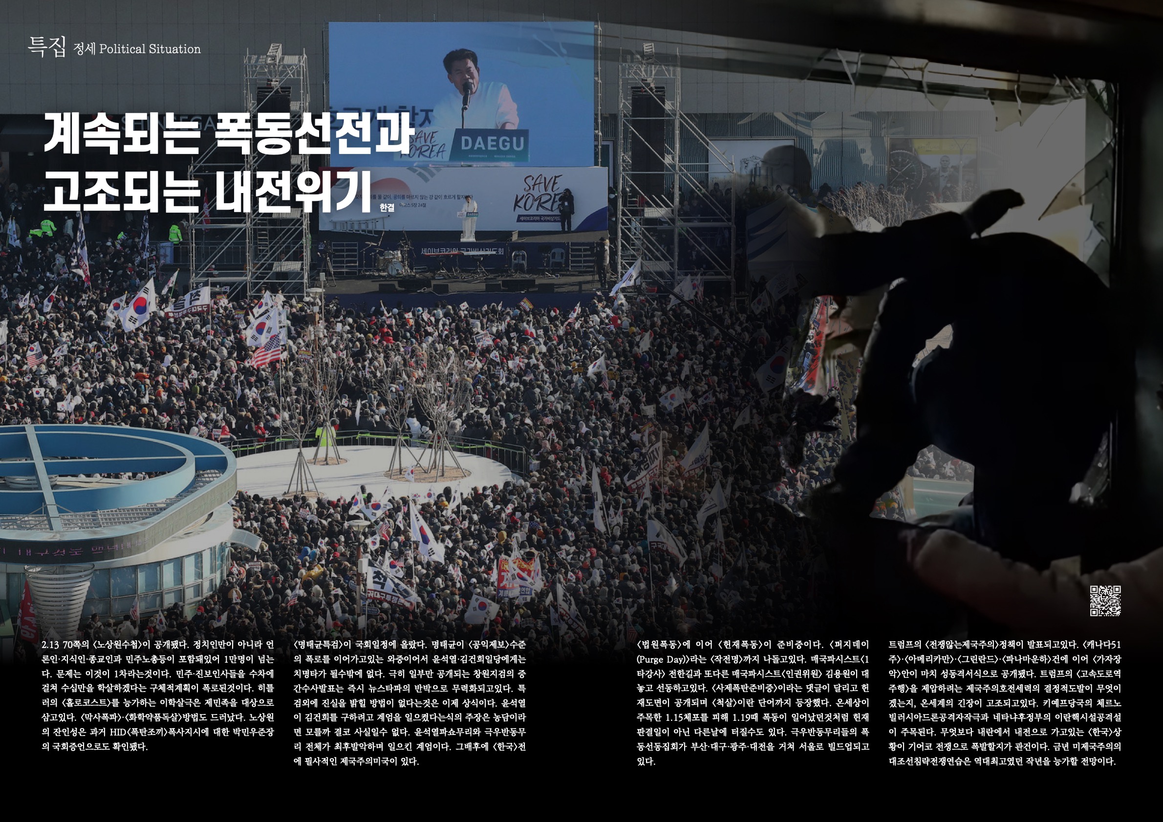 <법원폭동>에 이어 <헌재폭동>이 준비중이다. <퍼지데이(Purge Day)>라는 <작전명>까지 나돌고있다. 매국파시스트<1타강사> 전한길과 또다른 매국파시스트<인권위원> 김용원이 대놓고 선동하고있다. <사제폭탄준비중>이라는 댓글이 달리고 헌재도면이 공개되며 <척살>이란 단어까지 등장했다. 온세상이 주목한 1.15체포를 피해 1.19때 폭동이 일어났던것처럼 헌재판결일이 아닌 다른날에 터질수도 있다. 극우반동무리들의 폭동선동집회가 부산·대구·광주·대전을 거쳐 서울로 빌드업되고있다.