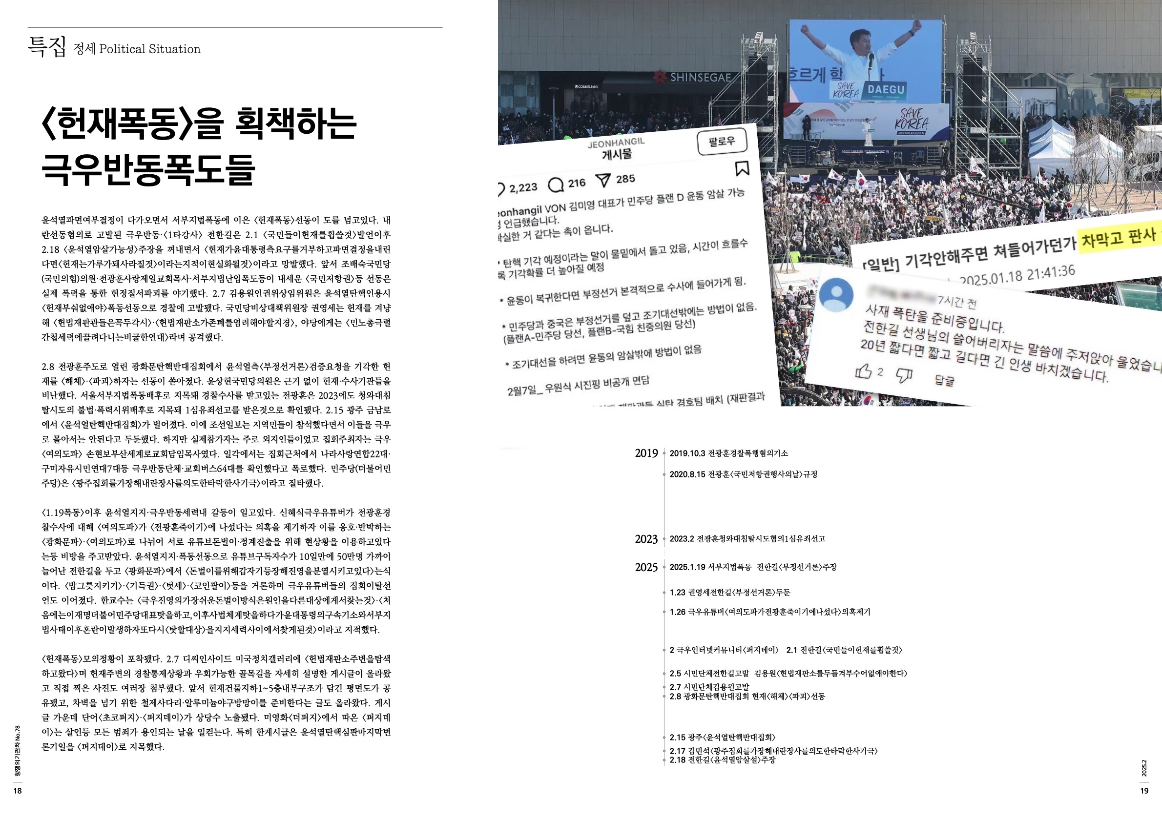 2.8 전광훈주도로 열린 광화문탄핵반대집회에서 윤석열측<부정선거론>검증요청을 기각한 헌재를 <해체>·<파괴>하자는 선동이 쏟아졌다. 윤상현국민당의원은 근거 없이 헌재·수사기관들을 비난했다. 서울서부지법폭동배후로 지목돼 경찰수사를 받고있는 전광훈은 2023에도 청와대침탈시도의 불법·폭력시위배후로 지목돼 1심유죄선고를 받은것으로 확인됐다. 2.15 광주 금남로에서 <윤석열탄핵반대집회>가 벌어졌다. 이에 조선일보는 지역민들이 참석했다면서 이들을 극우로 몰아서는 안된다고 두둔했다. 하지만 실제참가자는 주로 외지인들이었고 집회주최자는 극우<여의도파> 손현보부산세계로교회담임목사였다. 일각에서는 집회근처에서 나라사랑연합22대·구미자유시민연대7대등 극우반동단체·교회버스64대를 확인했다고 폭로했다. 민주당(더불어민주당)은 <광주집회를가장해내란장사를의도한타락한사기극>이라고 질타했다.
