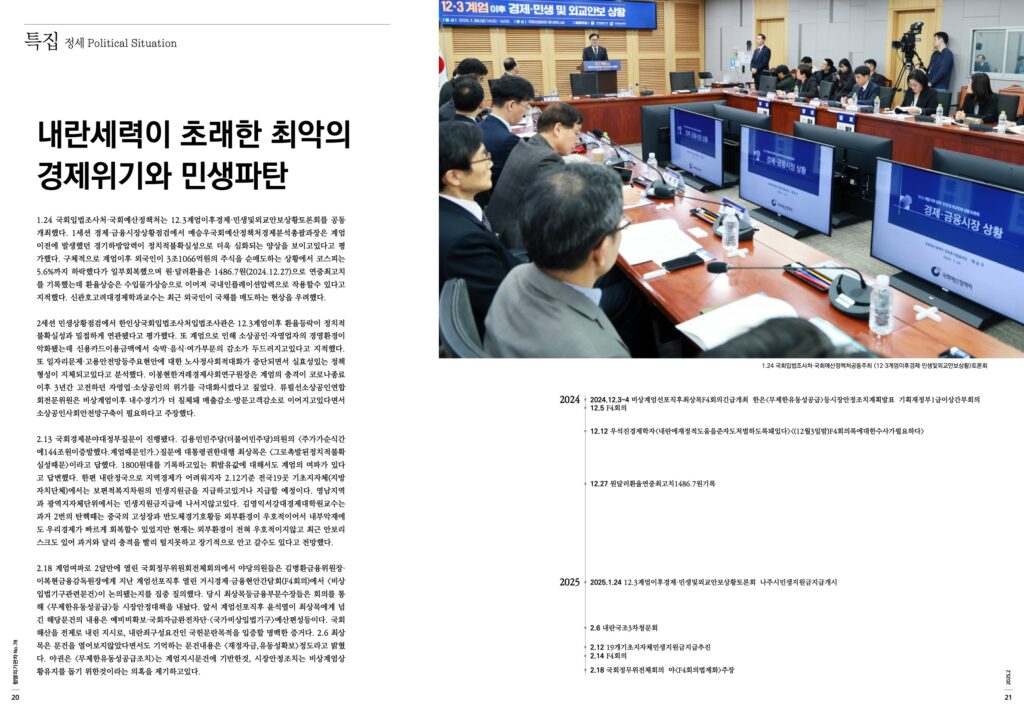 1.24 국회입법조사처·국회예산정책처는 12.3계엄이후경제·민생및외교안보상황토론회를 공동개최했다. 1세션 경제·금융시장상황점검에서 예승우국회예산정책처경제분석총괄과장은 계엄이전에 발생했던 경기하방압력이 정치적불확실성으로 더욱 심화되는 양상을 보이고있다고 평가했다. 구체적으로 계엄이후 외국인이 3조1066억원의 주식을 순매도하는 상황에서 코스피는 5.6%까지 하락했다가 일부회복했으며 원·달러환율은 1486.7원(2024.12.27)으로 연중최고치를 기록했는데 환율상승은 수입물가상승으로 이어져 국내인플레이션압력으로 작용할수 있다고 지적했다. 신관호고려대경제학과교수는 최근 외국인이 국채를 매도하는 현상을 우려했다.