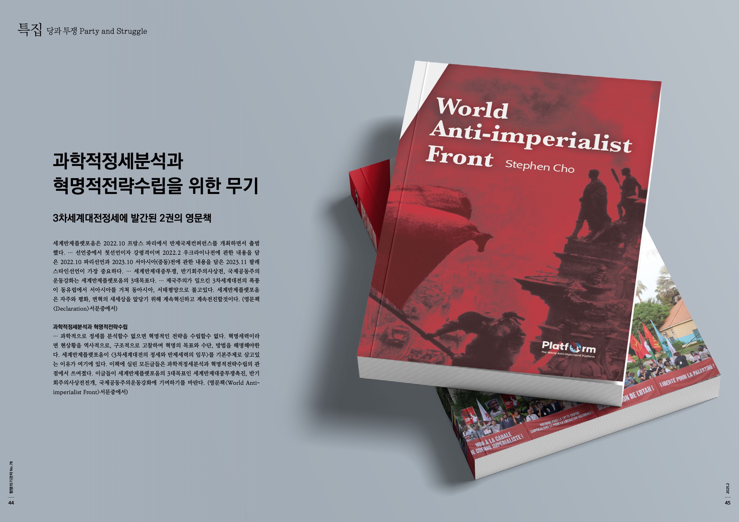 세계반제플랫포옴은 2022.10 프랑스 파리에서 반제국제컨퍼런스를 개최하면서 출범했다. … 선언중에서 첫선언이자 강령격이며 2022.2 우크라이나전에 관한 내용을 담은 2022.10 파리선언과 2023.10 서아시아(중동)전에 관한 내용을 담은 2023.11 팔레스타인선언이 가장 중요하다. … 세계반제대중투쟁, 반기회주의사상전, 국제공동주의운동강화는 세계반제플랫포옴의 3대목표다. … 제국주의가 일으킨 3차세계대전의 폭풍이 동유럽에서 서아시아를 거쳐 동아시아, 서태평양으로 불고있다. 세계반제플랫포옴은 자주와 평화, 변혁의 새세상을 앞당기 위해 계속혁신하고 계속전진할것이다. (영문책<Declaration>서문중에서)