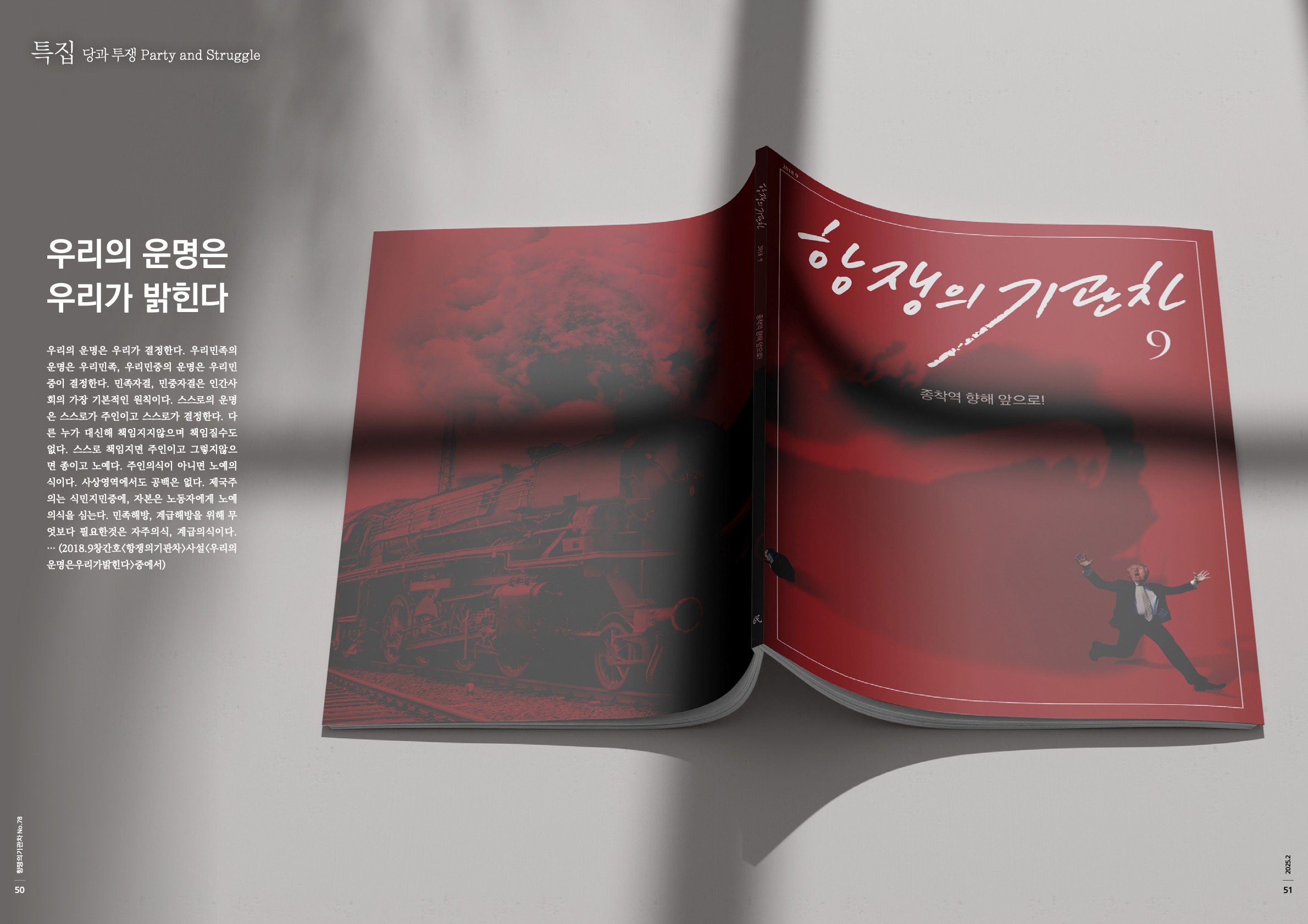 우리의 운명은 우리가 결정한다. 우리민족의 운명은 우리민족, 우리민중의 운명은 우리민중이 결정한다. 민족자결, 민중자결은 인간사회의 가장 기본적인 원칙이다. 스스로의 운명은 스스로가 주인이고 스스로가 결정한다. 다른 누가 대신해 책임지지않으며 책임질수도 없다. 스스로 책임지면 주인이고 그렇지않으면 종이고 노예다. 주인의식이 아니면 노예의식이다. 사상영역에서도 공백은 없다. 제국주의는 식민지민중에, 자본은 노동자에게 노예의식을 심는다. 민족해방, 계급해방을 위해 무엇보다 필요한것은 자주의식, 계급의식이다. … (2018.9창간호<항쟁의기관차>사설<우리의운명은우리가밝힌다>중에서)