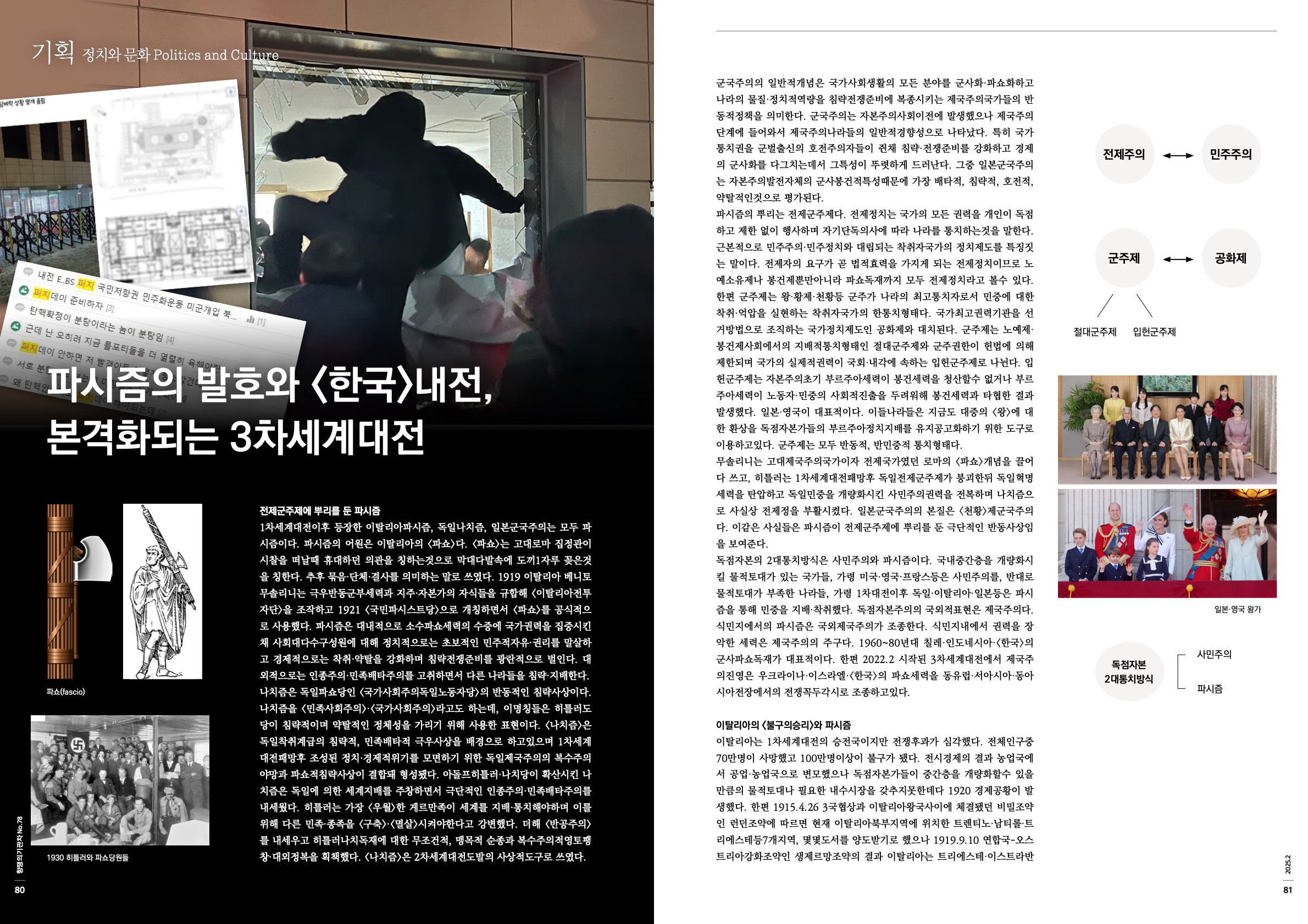 1차세계대전이후 등장한 이탈리아파시즘, 독일나치즘, 일본군국주의는 모두 파시즘이다. 파시즘의 어원은 이탈리아의 <파쇼>다. <파쇼>는 고대로마 집정관이 시찰을 떠날때 휴대하던 의관을 칭하는것으로 막대다발속에 도끼1자루 꽂은것을 칭한다. 추후 묶음·단체·결사를 의미하는 말로 쓰였다. 1919 이탈리아 베니토무솔리니는 극우반동군부세력과 지주·자본가의 자식들을 규합해 <이탈리아전투자단>을 조작하고 1921 <국민파시스트당>으로 개칭하면서 <파쇼>를 공식적으로 사용했다. 파시즘은 대내적으로 소수파쇼세력의 수중에 국가권력을 집중시킨채 사회대다수구성원에 대해 정치적으로는 초보적인 민주적자유·권리를 말살하고 경제적으로는 착취·약탈을 강화하며 침략전쟁준비를 광란적으로 벌인다. 대외적으로는 인종주의·민족배타주의를 고취하면서 다른 나라들을 침략·지배한다.