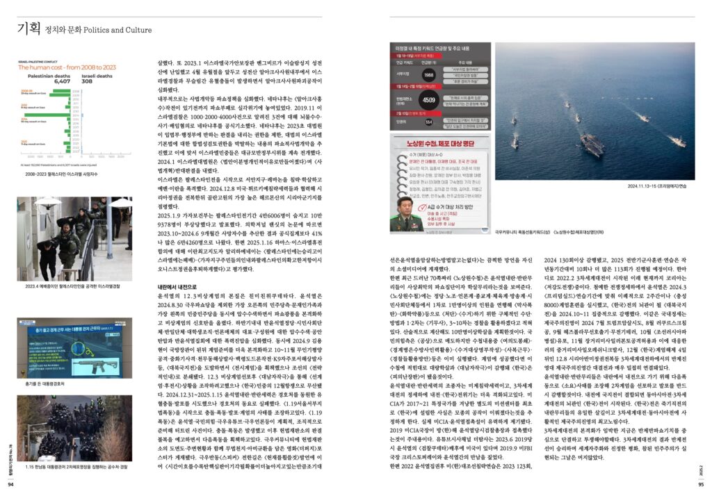 한편 2022 윤석열집권후 미<한>대조선침략연습은 2023 123회, 2024 130회이상 감행됐고, 2025 전반기군사훈련·연습은 작년동기간대비 10회나 더 많은 113회가 진행될 예정이다. 한마디로 2022.2 3차세계대전이 시작된 이래 현재까지 코리아는 <저강도전쟁>중이다. 첨예한 전쟁정세하에서 윤석열은 2024.3 <프리덤실드>연습기간에 맞춰 이례적으로 2주간이나 <충성8000>계엄훈련을 실시했고, <한국>전의 뇌관이 될 <대북국지전>을 2024.10~11 집중적으로 감행했다. 이같은 국내정세는 제국주의진영이 2024 7월 트럼프암살시도, 8월 러쿠르스크침공, 9월 헤즈볼라무선호출기·무전기테러, 10월 <조선러시아파병설>유포, 11월 장거리미사일러본토공격허용과 이에 대응한 러의 중거리미사일오레쉬니크발사, 12월 <한국>계엄해제 4일뒤인 12.8 시리아반미정권전복등 3차세계대전하에서의 반제진영대 제국주의진영간 대결전과 매우 밀접히 연결돼있다.