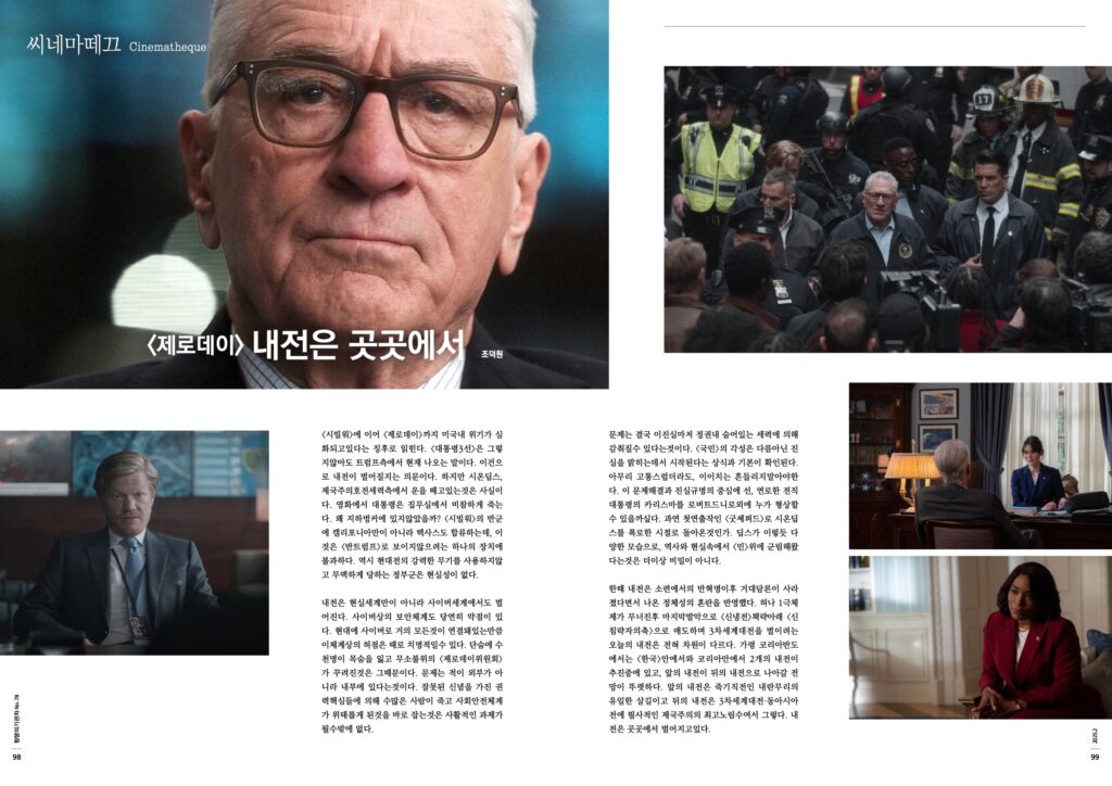 문제는 결국 이진실마저 정권내 숨어있는 세력에 의해 감춰질수 있다는것이다. <국민>의 각성은 다름아닌 진실을 밝히는데서 시작된다는 상식과 기본이 확인된다. 아무리 고통스럽더라도, 이이치는 흔들리지말아야한다. 이 문제해결과 진실규명의 중심에 선, 연로한 전직대통령의 카리스마를 로버트드니로외에 누가 형상할수 있을까싶다. 과연 첫연출작인 <굿셰퍼드>로 시온딥스를 폭로한 시절로 돌아온것인가. 딥스가 이렇듯 다양한 모습으로, 역사와 현실속에서 <민>위에 군림해왔다는것은 더이상 비밀이 아니다.