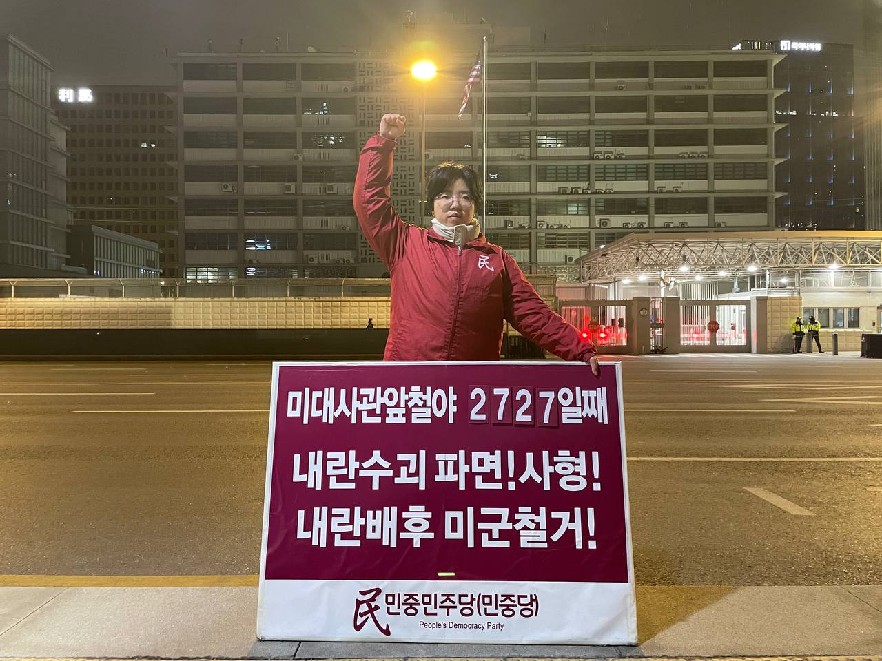 15일 민중민주당(민중당)은 미대사관앞에서 <내란수괴 파면!사형! 내란배후 미군철거!> 구호를 들고 평화시위를 3160일째 전개했다.