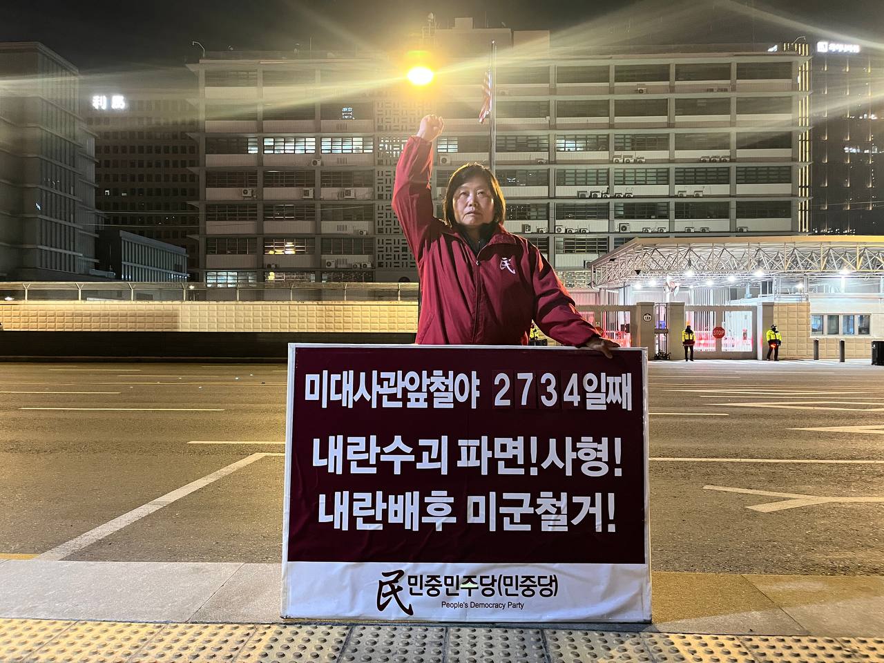 22일 민중민주당(민중당)은 미대사관앞에서 <내란수괴 파면!사형! 내란배후 미군철거!> 구호를 들고 평화시위를 3167일째 전개했다.