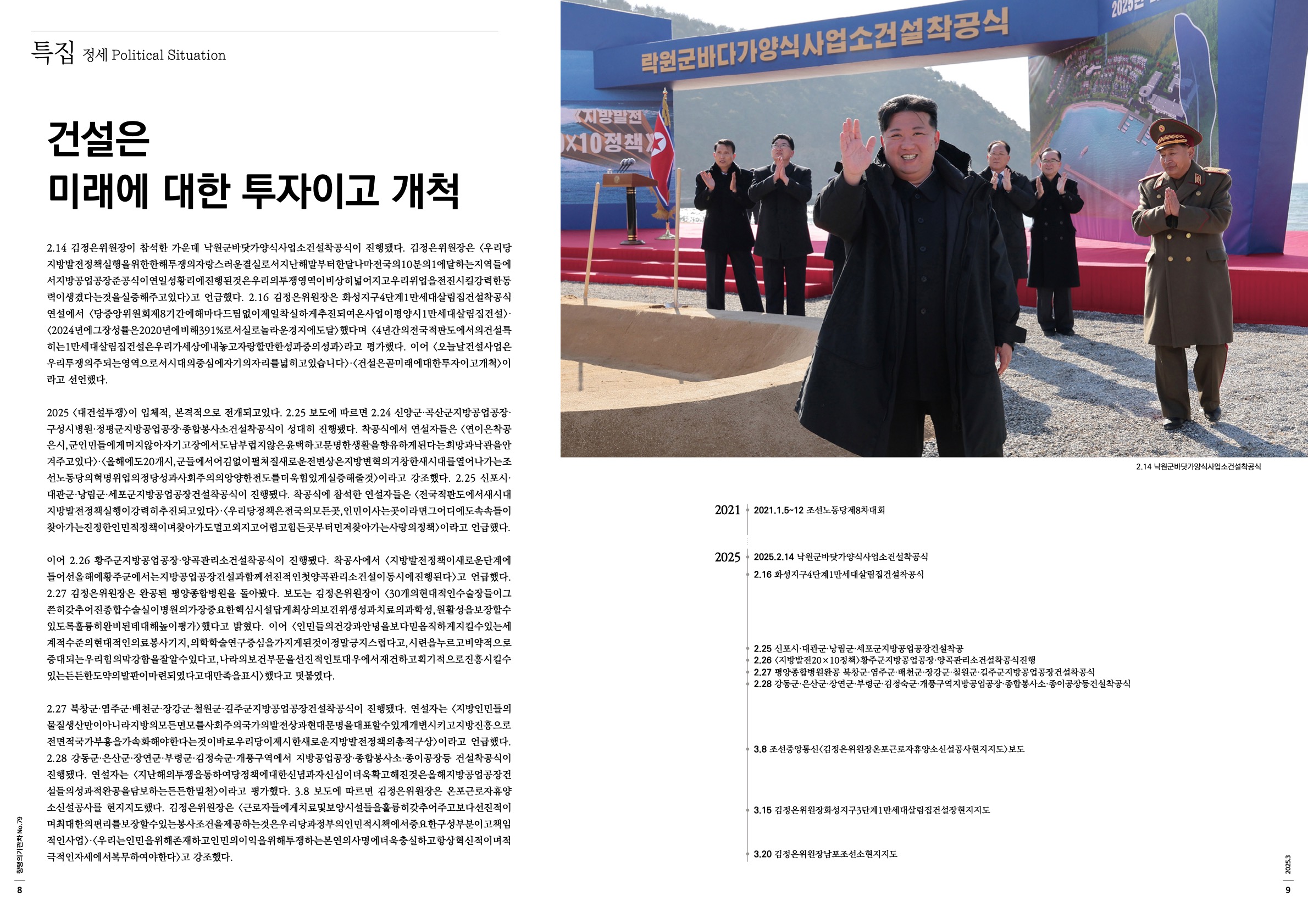 2.14 김정은위원장이 참석한 가운데 낙원군바닷가양식사업소건설착공식이 진행됐다. 김정은위원장은 <우리당지방발전정책실행을위한한해투쟁의자랑스러운결실로서지난해말부터한달나마전국의10분의1에달하는지역들에서지방공업공장준공식이연일성황리에진행된것은우리의투쟁영역이비상히넓어지고우리위업을전진시킬강력한동력이생겼다는것을실증해주고있다>고 언급했다. 2.16 김정은위원장은 화성지구4단계1만세대살림집건설착공식 연설에서 <당중앙위원회제8기간에해마다드팀없이제일착실하게추진되여온사업이평양시1만세대살림집건설>·<2024년에그장성률은2020년에비해391%로서실로놀라운경지에도달>했다며 <4년간의전국적판도에서의건설특히는1만세대살림집건설은우리가세상에내놓고자랑할만한성과중의성과>라고 평가했다. 이어 <오늘날건설사업은우리투쟁의주되는영역으로서시대의중심에자기의자리를넓히고있습니다>·<건설은곧미래에대한투자이고개척>이라고 선언했다.